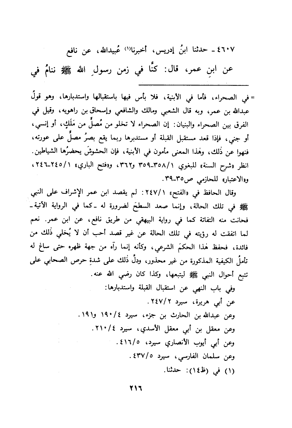 وقال الحافظ في "الفتح" ١/٢٤٧: لم يقصد ابن عمر الإشراف على النبي صَلَّى اللهُ عَلَيْهِ وَسَلَّمَ في تلك الحالة، وإنما صعد السطح لضرورة له -كما في الرواية الآتية- فحانت منه التفاتة كما في رواية البيهقي من طريق نافع، عن ابن عمر. نعم لما اتفقت له رؤيته في تلك الحالة عن غير قصد أحب أن لا يُخلى ذلك من فائدة، فحفظ هذا الحكم الشرعي، وكأنه إنما رآه من جهة ظهره حتى ساغ له تأمل الكيفية المذكورة من غير محذور، ودل ذلك على شدة حرص الصحابي على تتبع أحوال النبي صَلَّى اللهُ عَلَيْهِ وَسَلَّمَ ليتبعها، وكذا كان رضي الله عنه.