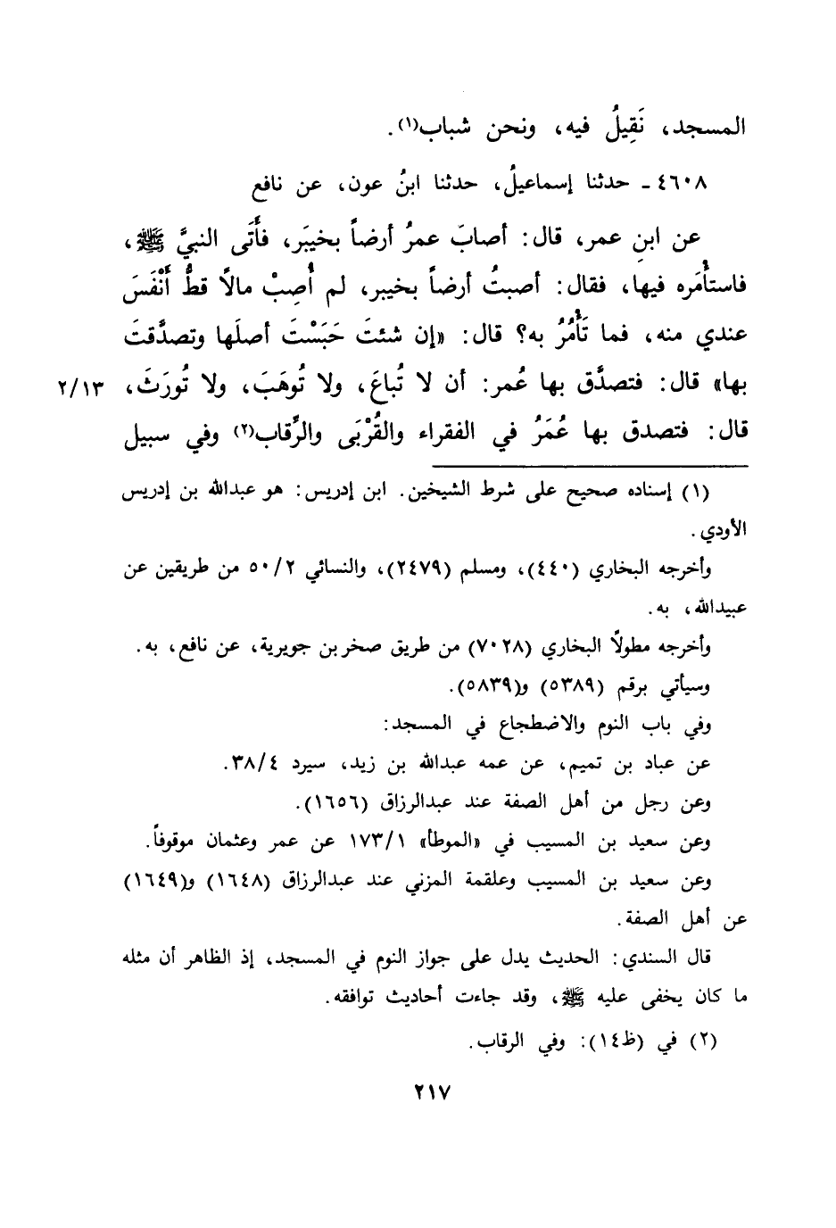 ٤٦٠٨ - حَدَّثَنَا إِسْمَاعِيلُ، حَدَّثَنَا ابْنُ عَوْنٍ، عَنْ نَافِعٍ، عَنِ ابْنِ عُمَرَ، قَالَ: أَصَابَ عُمَرُ أَرْضًا بِخَيْبَرَ، فَأَتَى النَّبِيَّ صَلَّى اللهُ عَلَيْهِ وَسَلَّمَ، فَاسْتَأْمَرَهُ فِيهَا، فَقَالَ: أَصَبْتُ أَرْضًا بِخَيْبَرَ، لَمْ أُصِبْ مَالًا قَطُّ أَنْفَسَ عِنْدِي مِنْهُ، فَمَا تَأْمُرُ بِهِ؟ قَالَ: " إِنْ شِئْتَ حَبَسْتَ أَصْلَهَا وَتَصَدَّقْتَ بِهَا " قَالَ: فَتَصَدَّقَ بِهَا عُمَرُ: " أَنْ لَا تُبَاعَ، وَلَا تُوهَبَ، وَلَا تُوَرَّثَ "، قَالَ: فَتَصَدَّقَ بِهَا عُمَرُ: " فِي الْفُقَرَاءِ، وَالْقُرْبَى، وَالرِّقَابِ، (٢) وَفِي سَبِيلِ