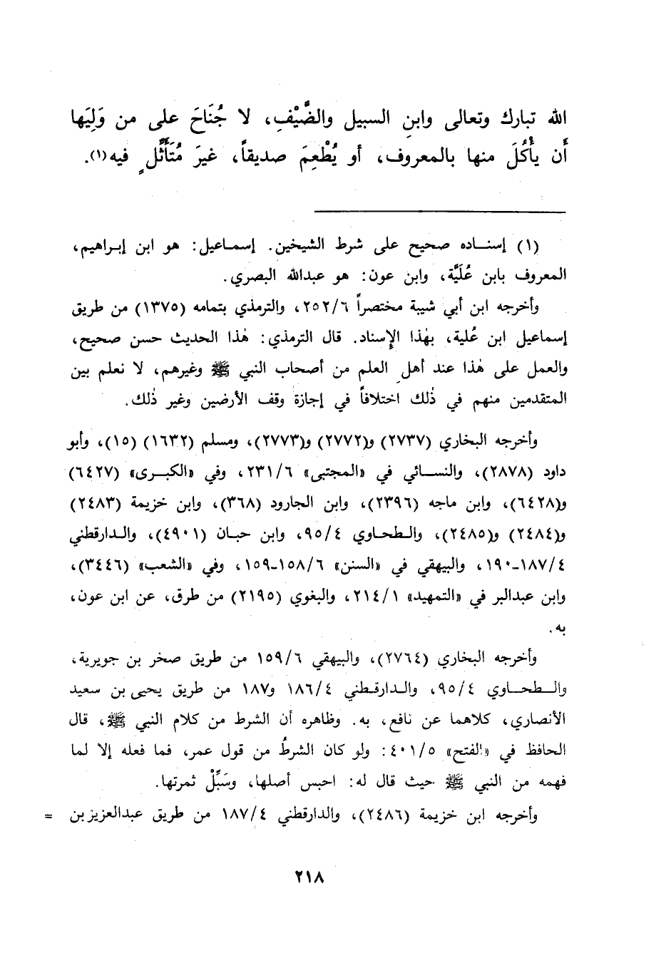 وأخرجه البخاري (٢٧٦٤) ، والبيهقي ٦/١٥٩ من طريى صخر بن جويرية، والطحاوي ٤/٩٥، والدارقطني ٤/١٨٦ و١٨٧ من طريق يحيي بن سعد الأنصاري، كلاهما عن نافع، به. وظاهره إن الشرط من كلام النبي صَلَّى اللهُ عَلَيْهِ وَسَلَّمَ، قال الحافظ في "الفتح" ٥/٤٠١: ولو كان الشرطُ من قول عمر، فما فعله إلا لما فهمه من النبي صَلَّى اللهُ عَلَيْهِ وَسَلَّمَ. حيث قال له: احبس أصلها، وسبل ثمرتها.
