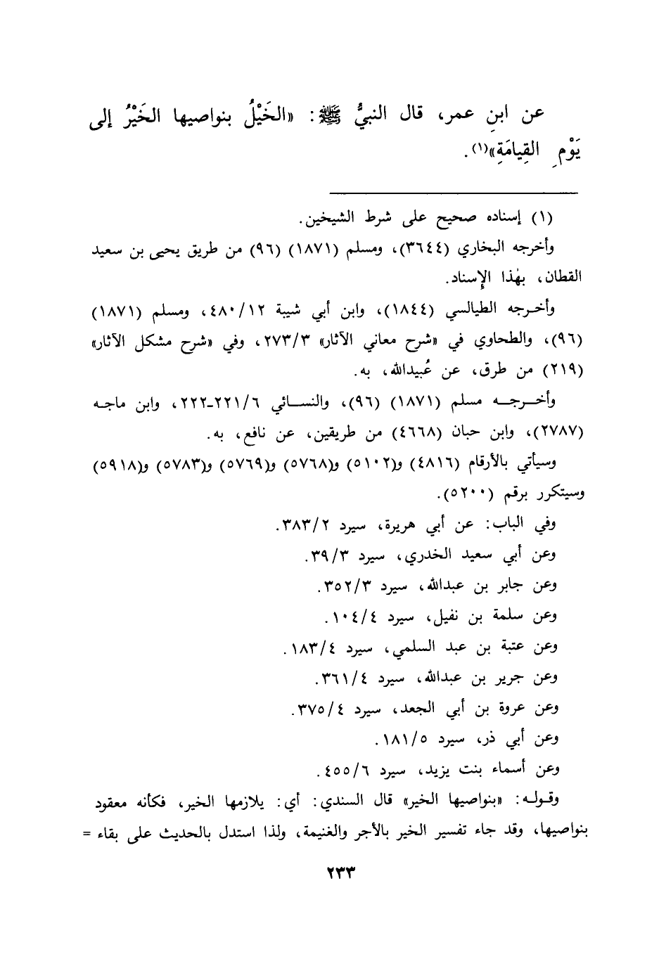 عَنِ ابْنِ عُمَرَ، قَالَ النَّبِيُّ صَلَّى اللهُ عَلَيْهِ وَسَلَّمَ: " الْخَيْلُ بِنَوَاصِيهَا الْخَيْرُ إِلَى يَوْمِ الْقِيَامَةِ " (١)