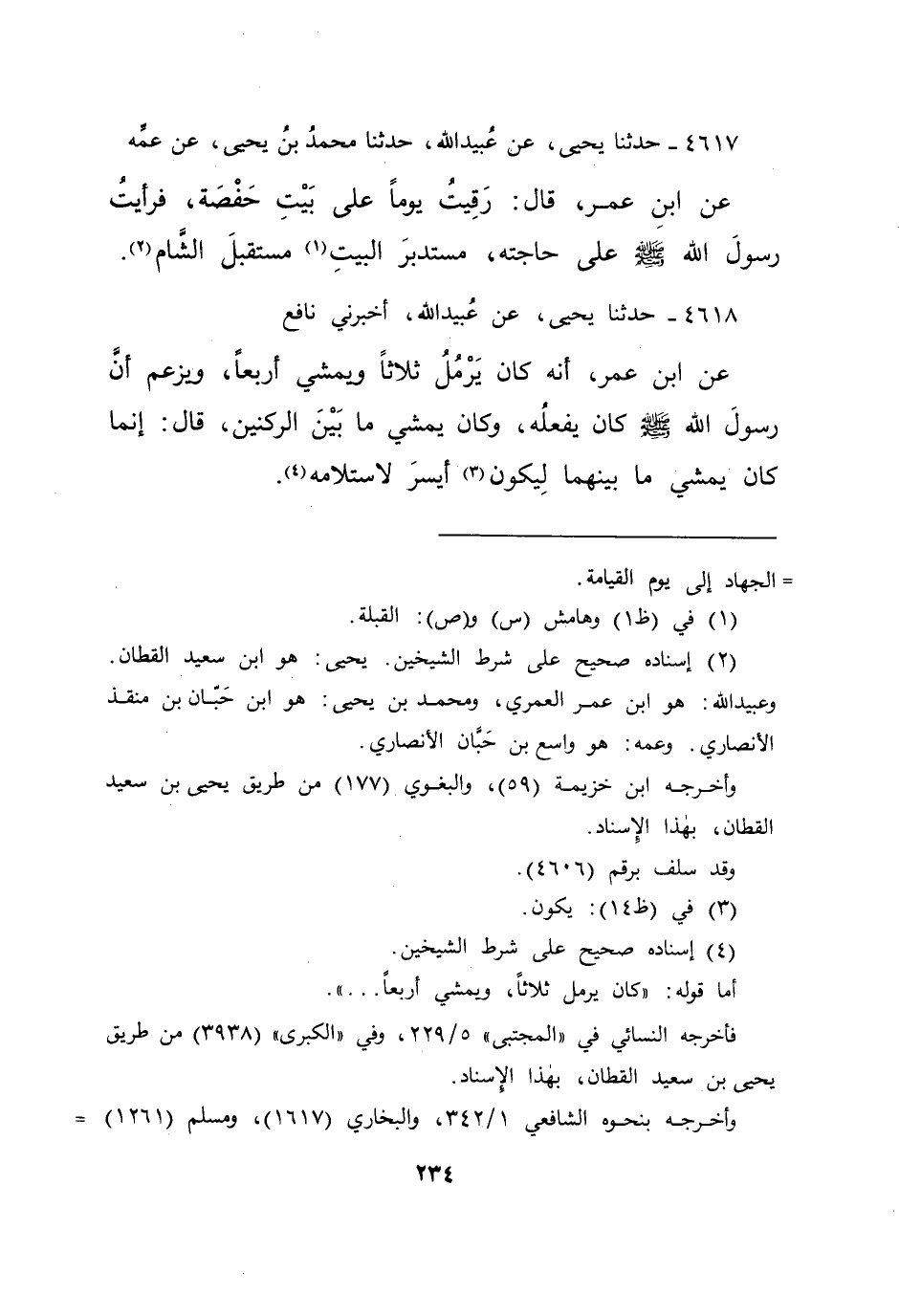٤٦١٨ - حَدَّثَنَا يَحْيَى، عَنْ عُبَيْدِ اللهِ، أَخْبَرَنِي نَافِعٌ، عَنِ ابْنِ عُمَرَ: " أَنَّهُ كَانَ يَرْمُلُ ثَلَاثًا، وَيَمْشِي أَرْبَعًا، وَيَزْعُمُ أَنَّ رَسُولَ اللهِ صَلَّى اللهُ عَلَيْهِ وَسَلَّمَ، كَانَ يَفْعَلُهُ "، وَكَانَ يَمْشِي مَا بَيْنَ الرُّكْنَيْنِ، قَالَ: إِنَّمَا كَانَ يَمْشِي مَا بَيْنَهُمَا لِيَكُونَ (٣) أَيْسَرَ لِاسْتِلَامِهِ (٤)