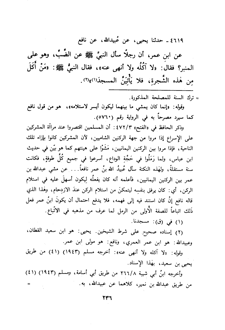 ٤٦١٩ - حَدَّثَنَا يَحْيَى، عَنْ عُبَيْدِ اللهِ، عَنْ نَافِعٍ، عَنِ ابْنِ عُمَرَ، أَنَّ رَجُلًا سَأَلَ النَّبِيَّ صَلَّى اللهُ عَلَيْهِ وَسَلَّمَ عَنِ الضَّبِّ، وَهُوَ عَلَى الْمِنْبَرِ؟ فَقَالَ: " لَا آكُلُهُ وَلَا أَنَهَى عَنْهُ "