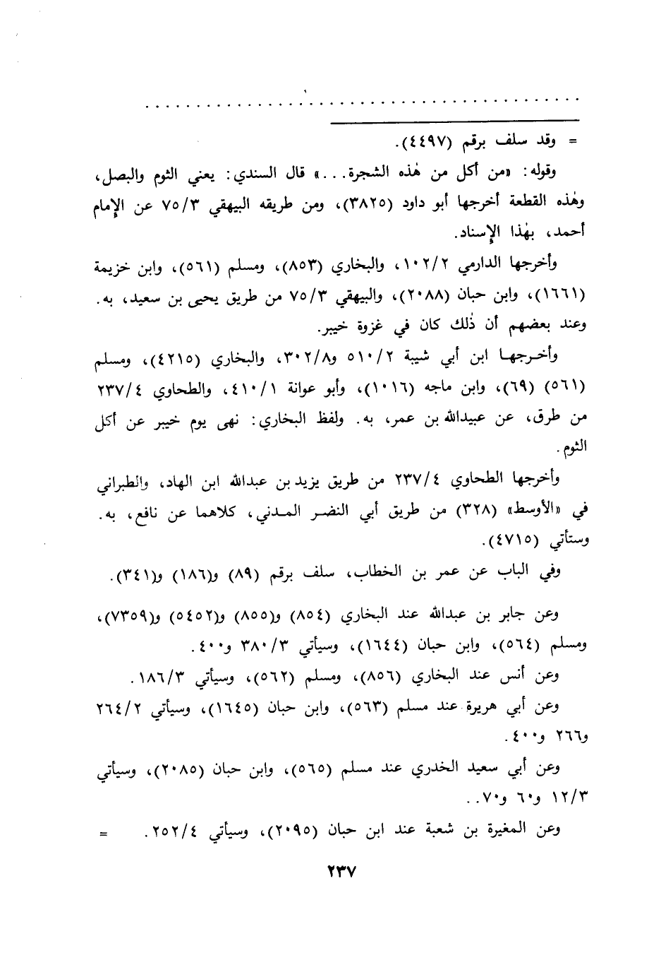 وأخرجها ابن أبي شيبة ٢/٥١٠ و٨/٣٠٢، والبخاري (٤٢١٥) ، ومسلم (٥٦١) (٦٩) ، وابن ماجه (١٠١٦) ، وأبو عوانة ١/٤١٠، والطحاوي ٤/٢٣٧ من طرق، عن عبيد الله بن عمر، به. ولفظ البخاري: نهى يوم خيبر عن أكل الثوم.