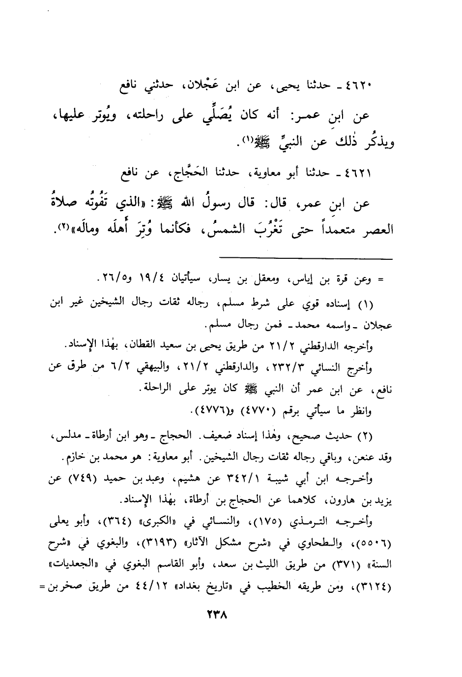 وأخرج النسائي ٣/٢٣٢، والدارقطني ٢/٢١، والبيهقي ٢/٦ من طرق عن نافع، عن ابن عمر أن النبي صَلَّى اللهُ عَلَيْهِ وَسَلَّمَ كان يوتر على الراحلة.
