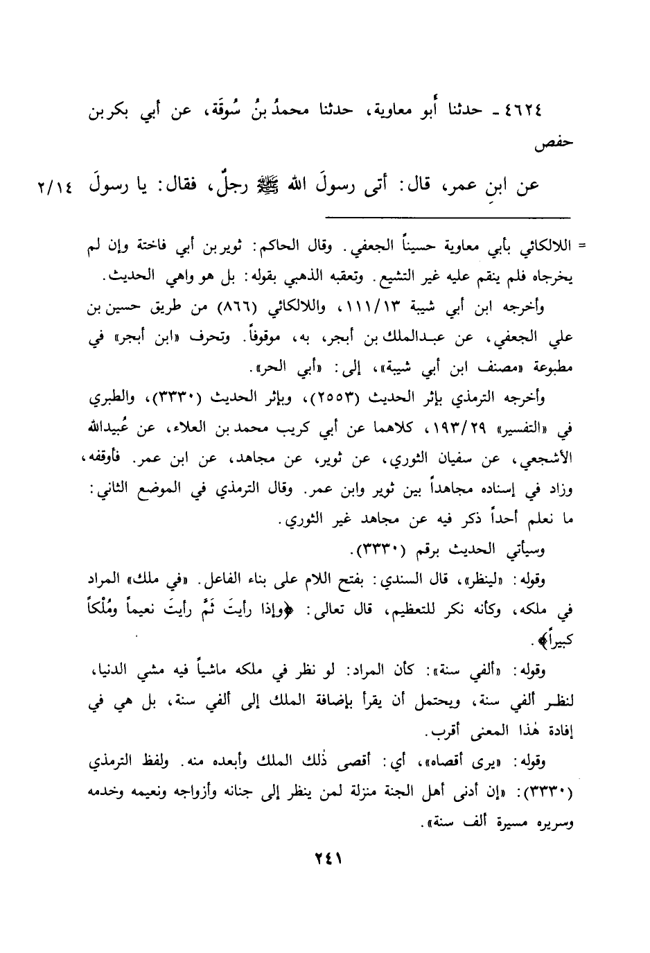 وأخرجه الترمذي بإثر الحديث (٢٥٥٣) ، وبإثر الحديث (٣٣٣٠) ، والطبري في "التفسير" ٢٩/١٩٣، كلاهما عن أبي كريب محمد بن العلاء، عن عبيد الله الأشجعي، عن سفيان الثوري، عن ثوير، عن مجاهد، عن ابن عمر. فأوقفه، وزاد في إسناده مجاهداً بين ثوير وابن عمر. وقال الترمذي في الموضع الثاني: ما نعلم أحداً ذكر فيه عن مجاهد غير الثوري.