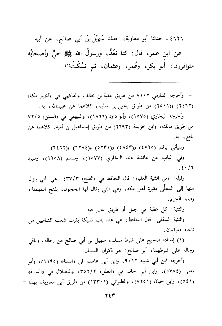 ٤٦٢٦ - حَدَّثَنَا أَبُو مُعَاوِيَةَ، حَدَّثَنَا سُهَيْلُ بْنُ أَبِي صَالِحٍ، عَنْ أَبِيهِ، عَنِ ابْنِ عُمَرَ، قَالَ: " كُنَّا نَعُدُّ، وَرَسُولُ اللهِ صَلَّى اللهُ عَلَيْهِ وَسَلَّمَ حَيٌّ وَأَصْحَابُهُ مُتَوَافِرُونَ: أَبُو بَكْرٍ، وَعُمَرُ، وَعُثْمَانُ ثُمَّ نَسْكُتُ " (١)