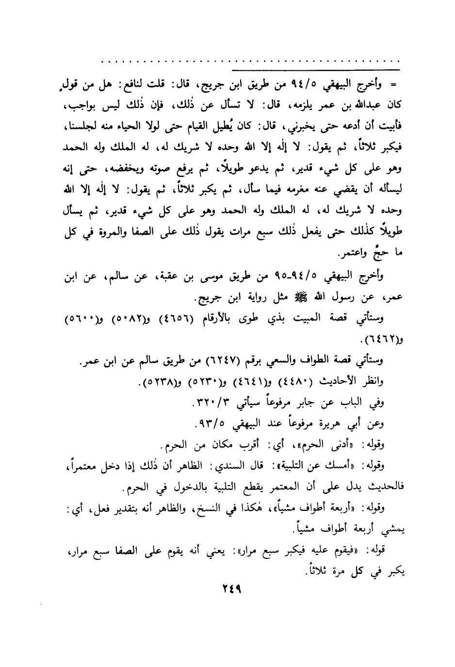 = وأخرج البيهقي ٥/٩٤ من طريق ابن جريج، قال: قلت لنافع: هل من قولٍ كان عبد الله بن عمر يلزمه، قال: لا تسأل عن ذلك، فإن ذلك ليس بواجب، فأبيت أن أدعه حتى يخبرني، قال: كان يُطيل القيام حتى لولا الحياء منه لجلسنا، فيكبر ثلاثاً، ثم يقول: لا إله إلا الله وحده لا شريك له، له الملك وله الحمد وهو على كل شيء قدير، ثم يدعو طويلا، ثم يرفع صوته ويخفضه، حتى إنه ليسأله أن يقضي عنه مغرمه فيما سأل، ثم يكبر ثلاثاً، ثم يقول: لا إله إلا الله وحده لا شريك له، له الملك وله الحمد وهو على كل شيء قدير، ثم يسأل طويلاً كذلك حتى يفعل ذلك سبع مرات يقول ذلك على الصفا والمروة في كل ما حج واعتمر.