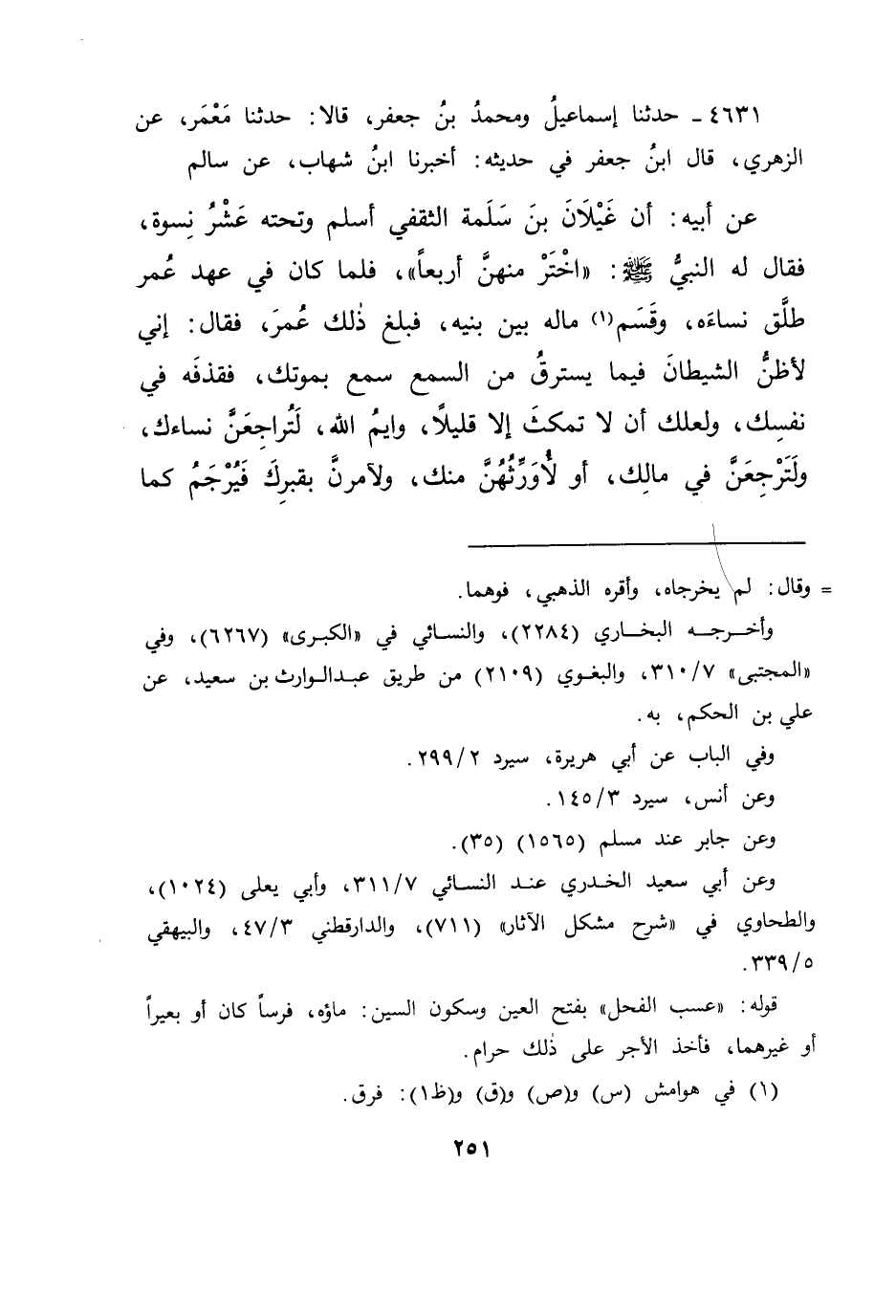٤٦٣١ - حَدَّثَنَا إِسْمَاعِيلُ، وَمُحَمَّدُ بْنُ جَعْفَرٍ، قَالَا: حَدَّثَنَا مَعْمَرٌ، عَنِ الزُّهْرِيِّ، قَالَ: ابْنُ جَعْفَرٍ، فِي حَدِيثِهِ أَخْبَرَنَا ابْنُ شِهَابٍ، عَنْ سَالِمٍ، عَنْ أَبِيهِ، أَنَّ غَيْلَانَ بْنَ سَلَمَةَ الثَّقَفِيَّ: أَسْلَمَ وَتَحْتَهُ عَشْرُ نِسْوَةٍ، فَقَالَ لَهُ النَّبِيُّ صَلَّى اللهُ عَلَيْهِ وَسَلَّمَ: " اخْتَرْ مِنْهُنَّ أَرْبَعًا " فَلَمَّا كَانَ فِي عَهْدِ عُمَرَ طَلَّقَ نِسَاءَهُ، وَقَسَمَ (١) مَالَهُ بَيْنَ بَنِيهِ، فَبَلَغَ ذَلِكَ عُمَرَ، فَقَالَ: " إِنِّي لَأَظُنُّ الشَّيْطَانَ فِيمَا يَسْتَرِقُ مِنَ السَّمْعِ سَمِعَ بِمَوْتِكَ، فَقَذَفَهُ فِي نَفْسِكَ، وَلَعَلَّكَ أَنْ لَا تَمْكُثَ إِلَّا قَلِيلًا، وَايْمُ اللهِ، لَتُرَاجِعَنَّ نِسَاءَكَ، وَلَتَرْجِعَنَّ فِي مَالِكَ، أَوْ لَأُوَرِّثُهُنَّ مِنْكَ، وَلَآمُرَنَّ بِقَبْرِكَ فَيُرْجَمُ كَمَا