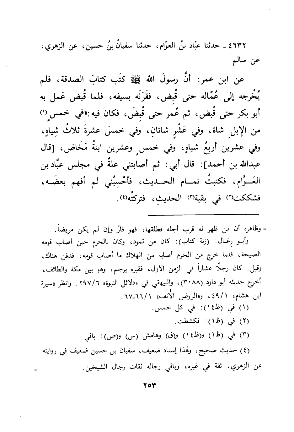 ٤٦٣٢ - حَدَّثَنَا عَبَّادُ بْنُ الْعَوَّامِ، حَدَّثَنَا سُفْيَانُ بْنُ حُسَيْنٍ، عَنِ الزُّهْرِيِّ، عَنْ سَالِمٍ، عَنِ ابْنِ عُمَرَ، أَنَّ رَسُولَ اللهِ صَلَّى اللهُ عَلَيْهِ وَسَلَّمَ: كَتَبَ كِتَابَ الصَّدَقَةِ، فَلَمْ يُخْرِجْهُ إِلَى عُمَّالِهِ حَتَّى قُبِضَ، فَقَرَنَهُ بِسَيْفِهِ، فَلَمَّا قُبِضَ عَمِلَ بِهِ أَبُو بَكْرٍ حَتَّى قُبِضَ، ثُمَّ عُمَرُ حَتَّى قُبِضَ، فَكَانَ فِيهِ: " فِي خَمْسٍ (١) مِنَ الْإِبِلِ شَاةٌ، وَفِي عَشْرٍ شَاتَانِ، وَفِي خَمْسَ عَشْرَةَ ثَلَاثُ شِيَاهٍ، وَفِي عِشْرِينَ أَرْبَعُ شِيَاهٍ، وَفِي خَمْسٍ وَعِشْرِينَ ابْنَةُ مَخَاضٍ "، قَالَ عَبْدُ اللهِ بْنُ أَحْمَدَ: قَالَ أَبِي: " ثُمَّ أَصَابَتْنِي عِلَّةٌ فِي مَجْلِسِ عَبَّادِ بْنِ الْعَوَّامِ، فَكَتَبْتُ تَمَامَ الْحَدِيثِ، فَأَحْسَبُنِي لَمْ أَفْهَمْ بَعْضَهُ، فَشَكَكْتُ (٢) فِي بَقِيَّةِ (٣) الْحَدِيثِ، فَتَرَكْتُهُ " (٤)