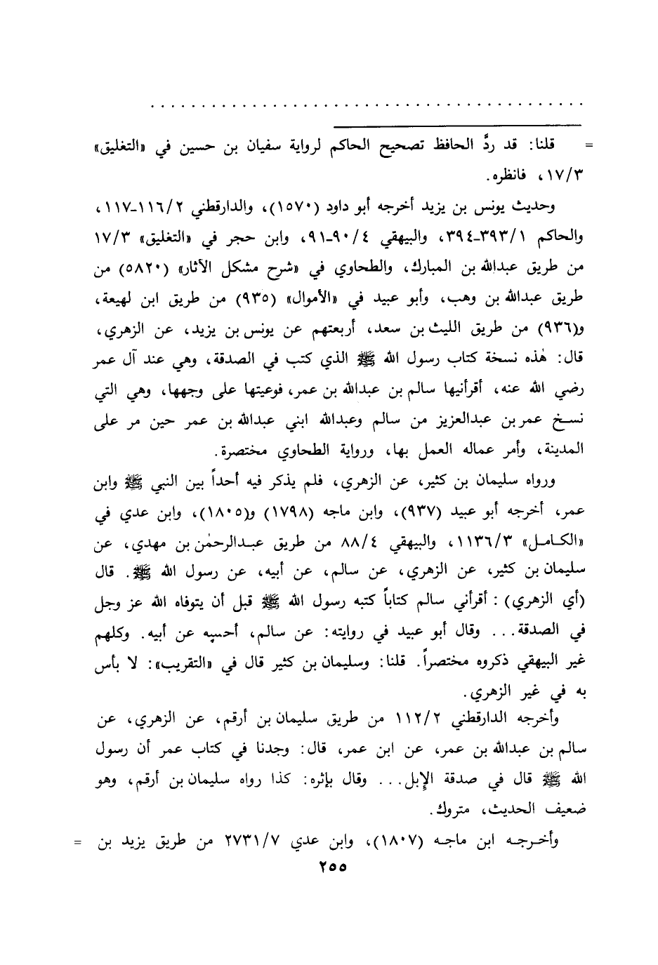 ورواه سليمان بن كثير، عن الزهري، فلم يذكر فيه أحداً بين النبي صَلَّى اللهُ عَلَيْهِ وَسَلَّمَ وابن عمر، أخرجه أبو عبيد (٩٣٧) ، وابن ماجه (١٧٩٨) و (١٨٠٥) ، وابن عدي في "الكامل" ٣/١١٣٦، والبيهقي ٤/٨٨ من طريق عبد الرحمن بن مهدي، عن سليمان بن كثير، عن الزهري، عن سالم، عن أبيه، عن رسول الله صَلَّى اللهُ عَلَيْهِ وَسَلَّمَ. قال (أي الزهري) : أقرأني سالم كتاباً كتبه رسول الله صَلَّى اللهُ عَلَيْهِ وَسَلَّمَ قبل أن يتوفاه الله عز وجل في الصدقة ... وقال أبو عبيد في روايته: عن سالم، أحسبه عن أبيه. وكلهم غير البيهقي ذكروه مختصراً. قلنا: وسليمان بن كثير قال في "التقريب": لا بأس به في غير الزهري.