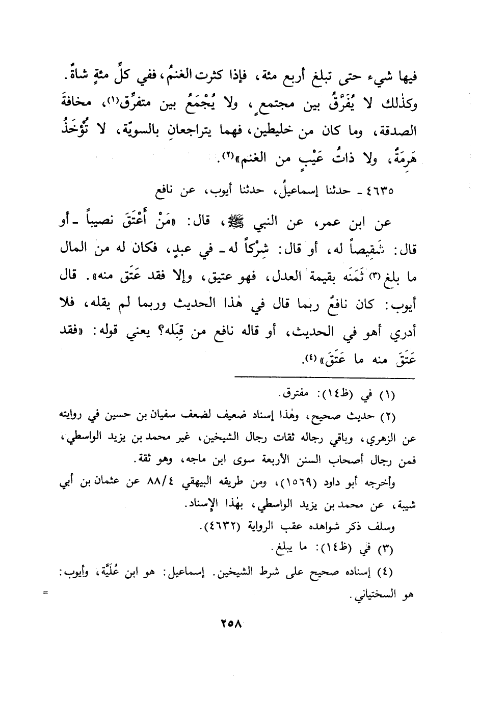 ٤٦٣٥ - حَدَّثَنَا إِسْمَاعِيلُ، حَدَّثَنَا أَيُّوبُ، عَنْ نَافِعٍ، عَنِ ابْنِ عُمَرَ، عَنِ النَّبِيِّ صَلَّى اللهُ عَلَيْهِ وَسَلَّمَ: " مَنْ أَعْتَقَ نَصِيبًا - أَوْ قَالَ: شَقِيصًا لَهُ، أَوْ قَالَ: شِرْكًا لَهُ - فِي عَبْدٍ، فَكَانَ لَهُ مِنَ الْمَالِ مَا بَلَغَ (٣) ثَمَنَهُ بِقِيمَةِ الْعَدْلِ، فَهُوَ عَتِيقٌ، وَإِلَّا فَقَدْ عَتَقَ مِنْهُ "، قَالَ أَيُّوبُ: " كَانَ نَافِعٌ رُبَّمَا قَالَ فِي هَذَا الْحَدِيثِ وَرُبَّمَا لَمْ يَقُلْهُ، فَلَا أَدْرِي أَهُوَ فِي الْحَدِيثِ، أَوْ قَالَهُ نَافِعٌ مِنْ قِبَلِهِ؟ - يَعْنِي قَوْلَهُ: فَقَدْ عَتَقَ مِنْهُ مَا عَتَقَ - " (٤)