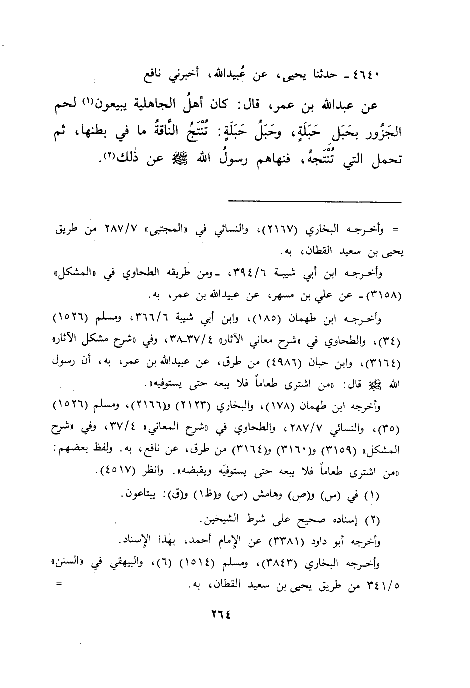٤٦٤٠ - حَدَّثَنَا يَحْيَى، عَنْ عُبَيْدِ اللهِ، أَخْبَرَنِي نَافِعٌ، عَنْ عَبْدِ اللهِ بْنِ عُمَرَ، قَالَ: كَانَ أَهْلُ الْجَاهِلِيَّةِ يَبِيعُونَ (١) لَحْمَ الْجَزُورِ بِحَبَلِ حَبَلَةٍ، وَحَبَلُ حَبَلَةٍ: تُنْتَجُ النَّاقَةُ مَا فِي بَطْنِهَا، ثُمَّ تَحْمِلُ الَّتِي تُنْتَجُهُ، " فَنَهَاهُمْ رَسُولُ اللهِ صَلَّى اللهُ عَلَيْهِ وَسَلَّمَ عَنْ ذَلِكَ " (٢)