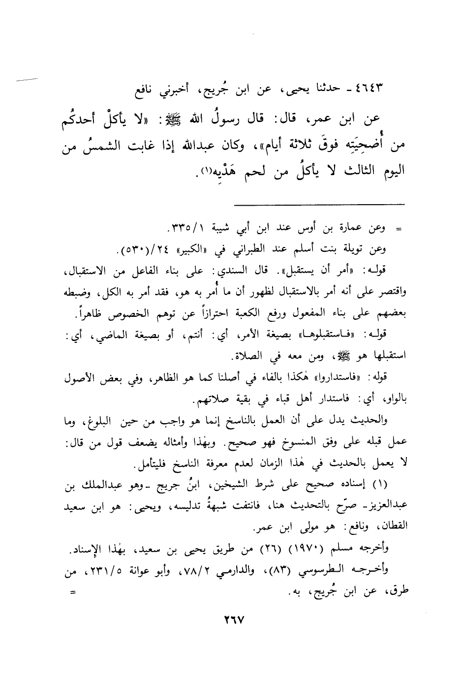 ٤٦٤٣ - حَدَّثَنَا يَحْيَى، عَنِ ابْنِ جُرَيْجٍ، أَخْبَرَنِي نَافِعٌ، عَنِ ابْنِ عُمَرَ، قَالَ: قَالَ رَسُولُ اللهِ صَلَّى اللهُ عَلَيْهِ وَسَلَّمَ " لَا يَأْكُلْ أَحَدُكُمْ مِنْ أُضْحِيَّتِهِ فَوْقَ ثَلَاثَةِ أَيَّامٍ " " وَكَانَ عَبْدُ اللهِ إِذَا غَابَتِ الشَّمْسُ مِنَ الْيَوْمِ الثَّالِثِ لَا يَأْكُلُ مِنْ لَحْمِ هَدْيِهِ " (١)