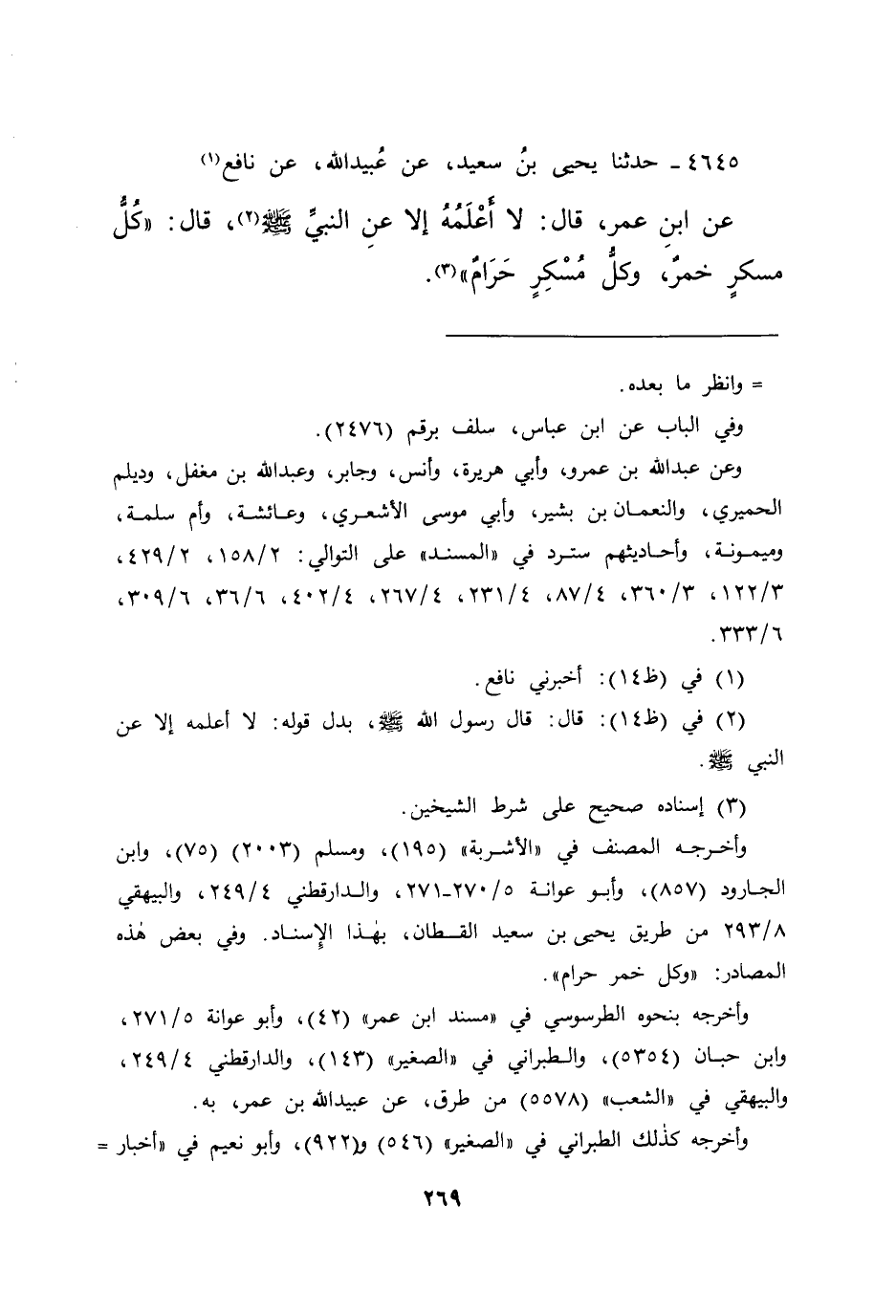 ٤٦٤٥ - حَدَّثَنَا يَحْيَى بْنُ سَعِيدٍ، عَنْ عُبَيْدِ اللهِ، عَنْ نَافِعٍ، (١) عَنِ ابْنِ عُمَرَ، قَالَ: لَا أَعْلَمُهُ إِلَّا عَنِ النَّبِيِّ صَلَّى اللهُ عَلَيْهِ وَسَلَّمَ (٢) قَالَ: " كُلُّ مُسْكِرٍ خَمْرٌ، وَكُلُّ مُسْكِرٍ حَرَامٌ " (٣)