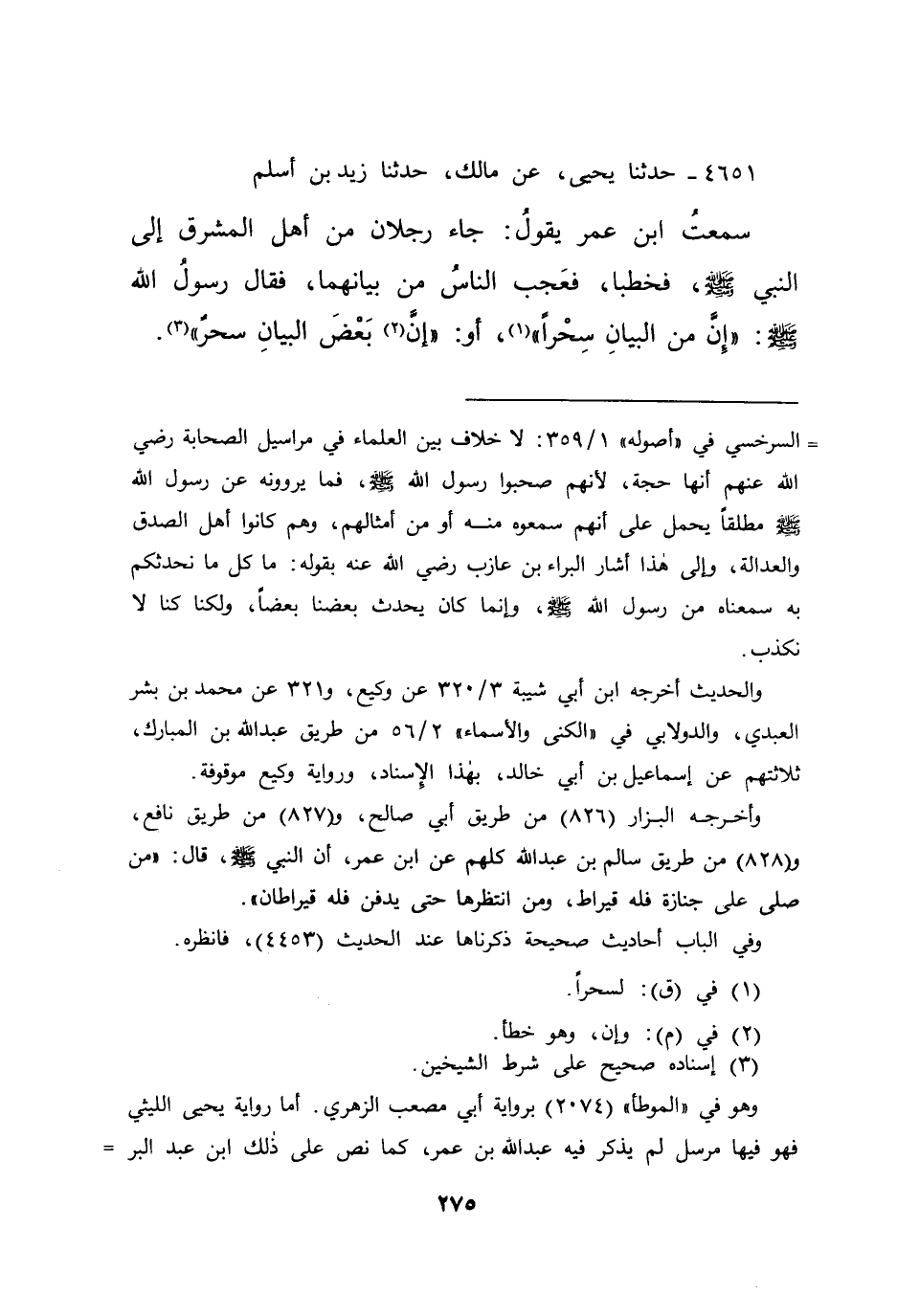 ٤٦٥١ - حَدَّثَنَا يَحْيَى، عَنْ مَالِكٍ، حَدَّثَنَا زَيْدُ بْنُ أَسْلَمَ، سَمِعْتُ ابْنَ عُمَرَ، يَقُولُ: جَاءَ رَجُلَانِ مِنْ أَهْلِ الْمَشْرِقِ إِلَى النَّبِيِّ صَلَّى اللهُ عَلَيْهِ وَسَلَّمَ، فَخَطَبَا، فَعَجِبَ النَّاسُ مِنْ بَيَانِهِمَا، فَقَالَ رَسُولُ اللهِ صَلَّى اللهُ عَلَيْهِ وَسَلَّمَ: " إِنَّ مِنَ الْبَيَانِ سِحْرًا " (١) أَوْ: " إِنَّ (٢) بَعْضَ الْبَيَانِ سِحْرٌ " (٣)