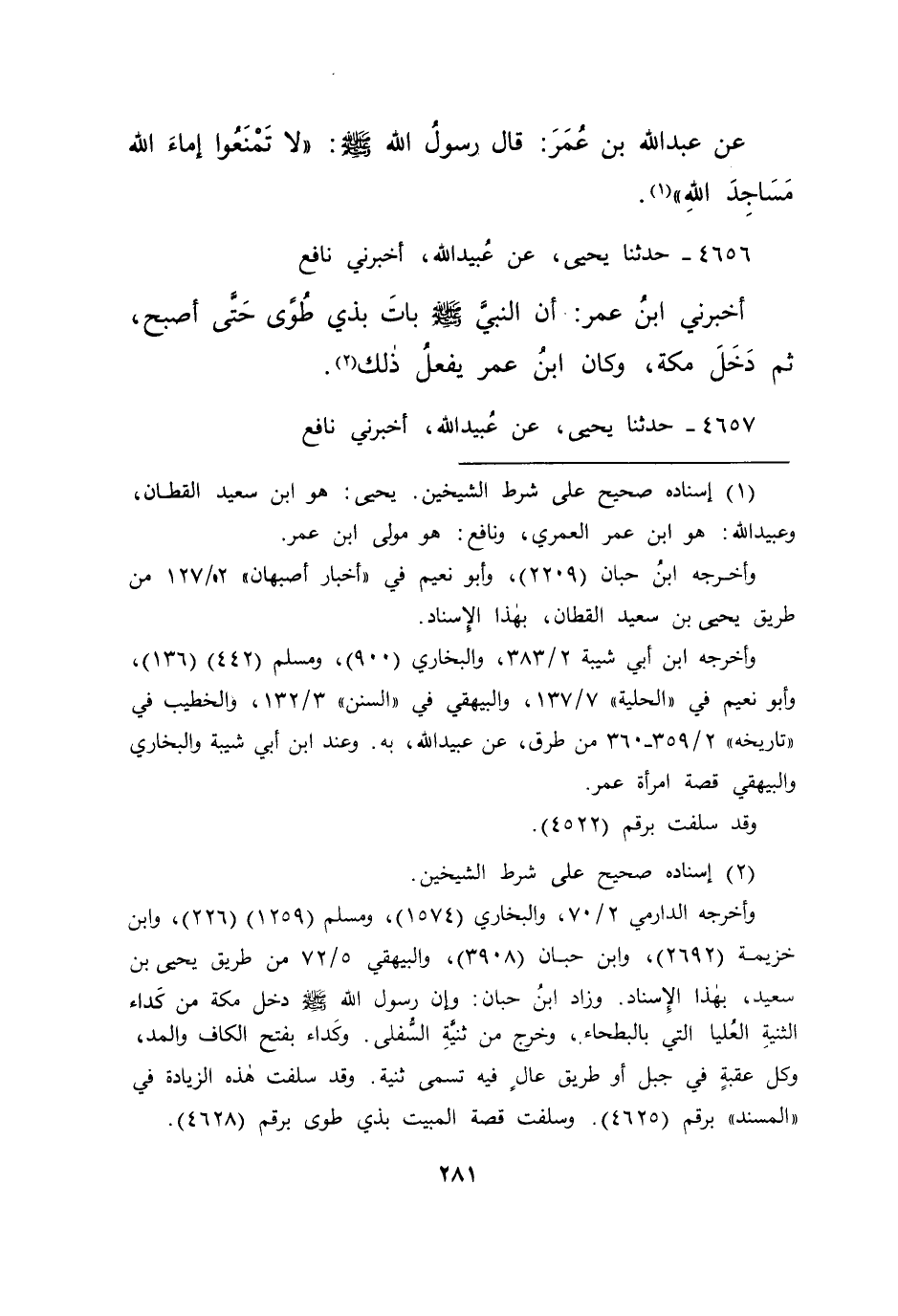 ٤٦٥٦ - حَدَّثَنَا يَحْيَى، عَنْ عُبَيْدِ اللهِ، أَخْبَرَنِي نَافِعٌ، أَخْبَرَنِي ابْنُ عُمَرَ: " أَنَّ النَّبِيَّ صَلَّى اللهُ عَلَيْهِ وَسَلَّمَ: بَاتَ بِذِي طُوًى حَتَّى أَصْبَحَ، ثُمَّ دَخَلَ مَكَّةَ " " وَكَانَ ابْنُ عُمَرَ يَفْعَلُ ذَلِكَ " (٢)