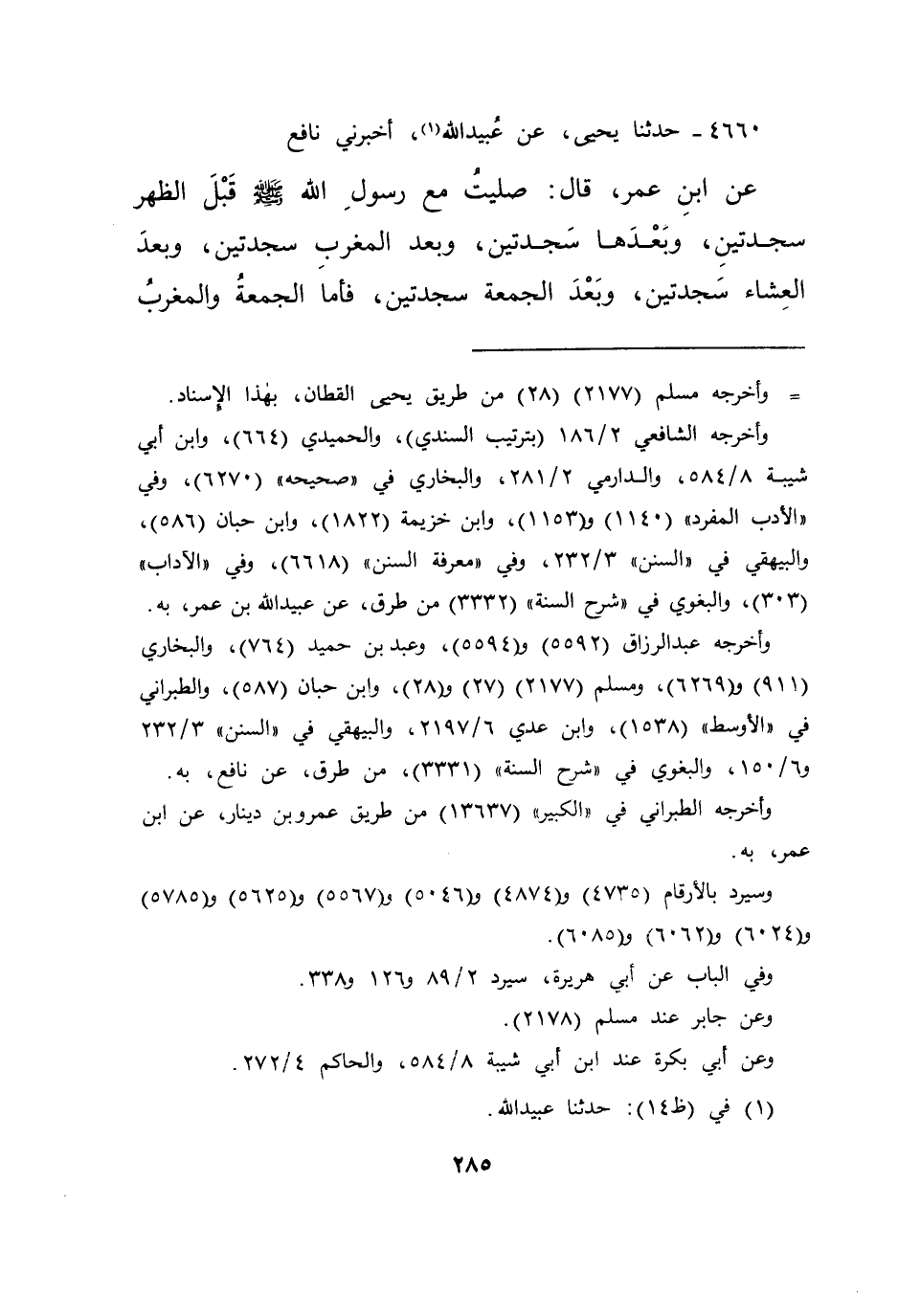 ٤٦٦٠ - حَدَّثَنَا يَحْيَى، عَنْ عُبَيْدِ اللهِ، (١) أَخْبَرَنِي نَافِعٌ، عَنِ ابْنِ عُمَرَ، قَالَ: " صَلَّيْتُ مَعَ رَسُولِ اللهِ صَلَّى اللهُ عَلَيْهِ وَسَلَّمَ، قَبْلَ الظُّهْرِ سَجْدَتَيْنِ، وَبَعْدَهَا سَجْدَتَيْنِ، وَبَعْدَ الْمَغْرِبِ سَجْدَتَيْنِ، وَبَعْدَ الْعِشَاءِ سَجْدَتَيْنِ، وَبَعْدَ الْجُمُعَةِ سَجْدَتَيْنِ، فَأَمَّا الْجُمُعَةُ وَالْمَغْرِبُ