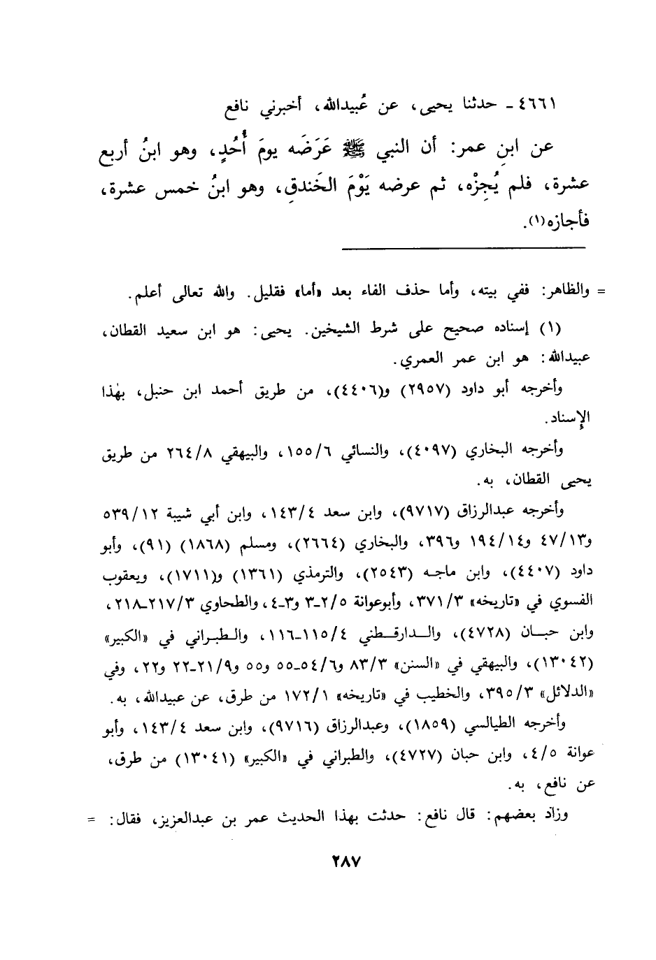 ٤٦٦١ - حَدَّثَنَا يَحْيَى، عَنْ عُبَيْدِ اللهِ، أَخْبَرَنِي نَافِعٌ، عَنِ ابْنِ عُمَرَ: " أَنَّ النَّبِيَّ صَلَّى اللهُ عَلَيْهِ وَسَلَّمَ: عَرَضَهُ يَوْمَ أُحُدٍ، وَهُوَ ابْنُ أَرْبَعَ عَشْرَةَ، فَلَمْ يُجِزْهُ، ثُمَّ عَرَضَهُ يَوْمَ الْخَنْدَقِ، وَهُوَ ابْنُ خَمْسَ عَشْرَةَ، فَأَجَازَهُ " (١)