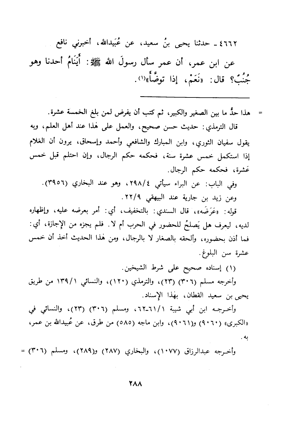 قال الترمذي: حديث حسن صحيح، والعمل على هذا عند أهل العلم، وبه يقول سفيان الثوري، وابن المبارك والشافعي وأحمد وإسحاق، يرون أن الغلام إذا استكمل خمس عشرة سنة، فحكمه حكم الرجال، وإن احتلم قبل خمس عشرة، فحكمه حكم الرجال.