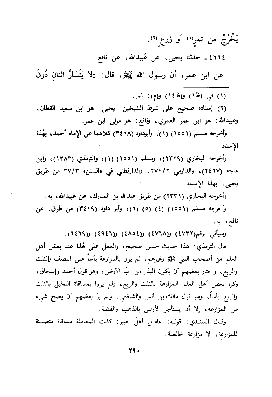 قال الترمذي: هذا حديث حسن صحيح، والعمل على هذا عند بعض أهل العلم من أصحاب النبي صَلَّى اللهُ عَلَيْهِ وَسَلَّمَ وغيرهم، لم يروا بالمزارعة بأساً على النصف والثلث والربع، واختار بعضهم أن يكون البذر من رب الأرض، وهو قول أحمد وإسحاق، وكره بعض أم العلم المزارعة بالثلث والربع، ولم يروا بمساقاة النخيل بالثلث والربع بأساً، وهو قول مالك بن أنس والشافعي، ولما ير بعضهم أن يصح شيء من المزارعة، إلا أن يستأجر الأرض بالذهب والفضة.