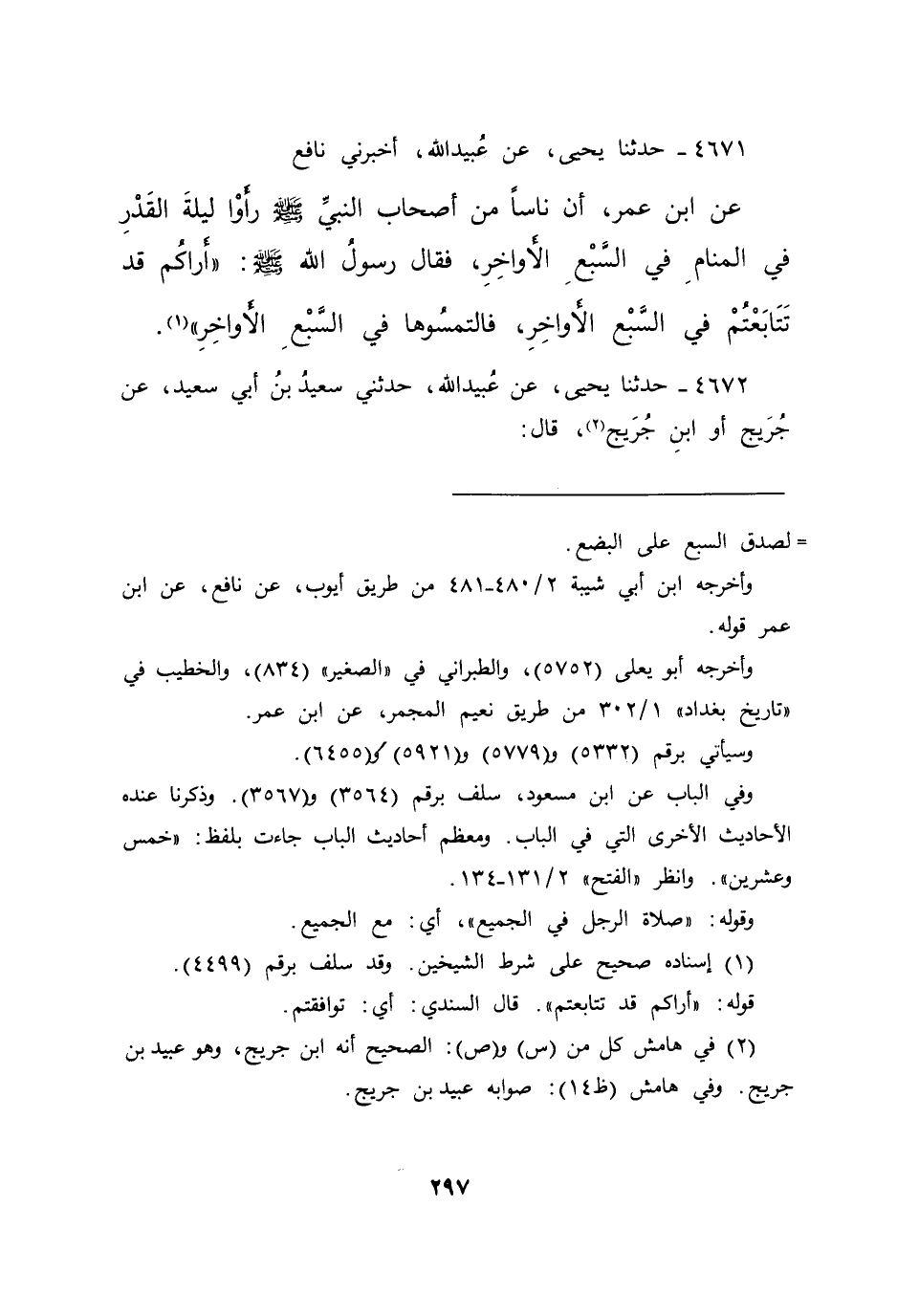 ٤٦٧١ - حَدَّثَنَا يَحْيَى، عَنْ عُبَيْدِ اللهِ، أَخْبَرَنِي نَافِعٌ، عَنِ ابْنِ عُمَرَ، أَنَّ نَاسًا مِنْ أَصْحَابِ النَّبِيِّ صَلَّى اللهُ عَلَيْهِ وَسَلَّمَ، رَأَوْا لَيْلَةَ الْقَدْرِ فِي الْمَنَامِ فِي السَّبْعِ الْأَوَاخِرِ، فَقَالَ رَسُولُ اللهِ صَلَّى اللهُ عَلَيْهِ وَسَلَّمَ: " أَرَاكُمْ قَدْ تَتَابَعْتُمْ فِي السَّبْعِ الْأَوَاخِرِ فَالْتَمِسُوهَا فِي السَّبْعِ الْأَوَاخِرِ " (١)