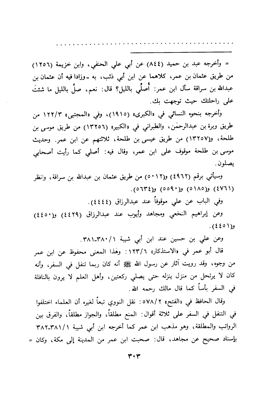 وقال الحافظ في "الفتح" ٢/٥٧٨: نقل النووي تبعاً لغيره أن العلماء اختلفوا في التنفل في السفر على ثلاثة أقوال: المنع مطلقاً، والجواز مطلقاً، والفرق بين الرواتب والمطلقة، وهو مذهب ابن عمر كما أخرجه ابن أبي شيبة ١/٣٨١-٣٨٢ بإسناد صحيح عن مجاهد، قال: صحبت ابن عمر من المدينة إلى مكة، وكان=