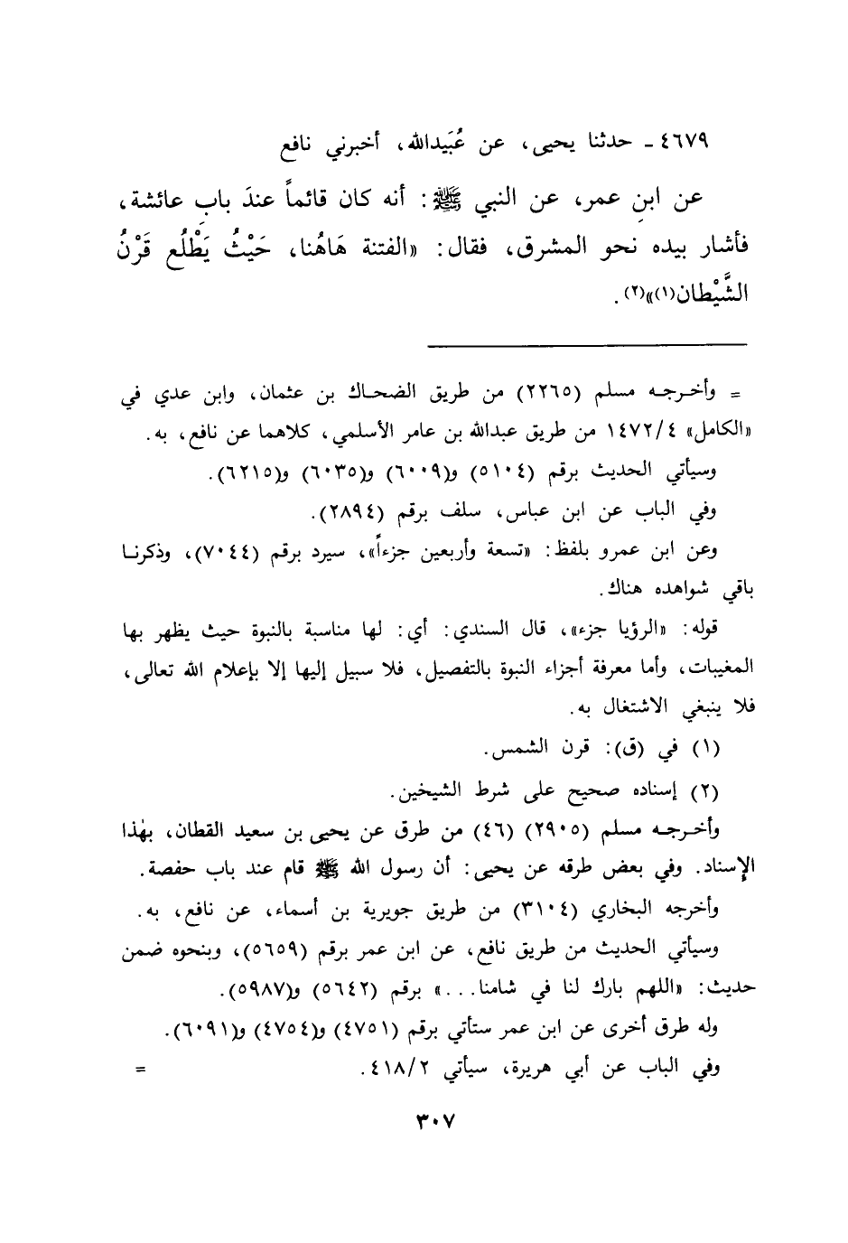 ٤٦٧٩ - حَدَّثَنَا يَحْيَى، عَنْ عُبَيْدِ اللهِ، أَخْبَرَنِي نَافِعٌ، عَنِ ابْنِ عُمَرَ، عَنِ النَّبِيِّ صَلَّى اللهُ عَلَيْهِ وَسَلَّمَ: أَنَّهُ كَانَ قَائِمًا عِنْدَ بَابِ عَائِشَةَ: فَأَشَارَ بِيَدِهِ نَحْوَ الْمَشْرِقِ، فَقَالَ: " الْفِتْنَةُ هَاهُنَا، حَيْثُ يَطْلُعُ قَرْنُ الشَّيْطَانِ (١) " (٢)