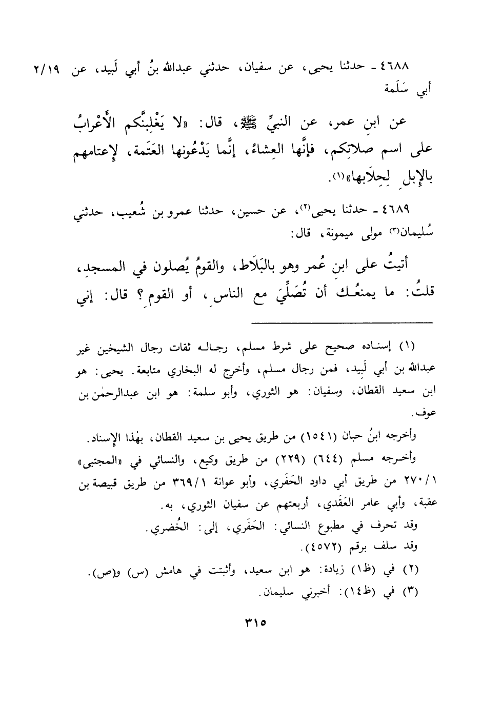 ٤٦٨٨ - حَدَّثَنَا يَحْيَى، عَنْ سُفْيَانَ، حَدَّثَنِي عَبْدُ اللهِ بْنُ أَبِي لَبِيدٍ، عَنْ أَبِي سَلَمَةَ، عَنِ ابْنِ عُمَرَ، عَنِ النَّبِيِّ صَلَّى اللهُ عَلَيْهِ وَسَلَّمَ قَالَ: " لَا يَغْلِبَنَّكُمْ الْأَعْرَابُ عَلَى اسْمِ صَلَاتِكُمْ، فَإِنَّهَا الْعِشَاءُ، إِنَّمَا يَدْعُونَهَا الْعَتَمَةَ، لِإِعْتَامِهِمْ بِالْإِبِلِ لِحِلَابِهَا " (١)