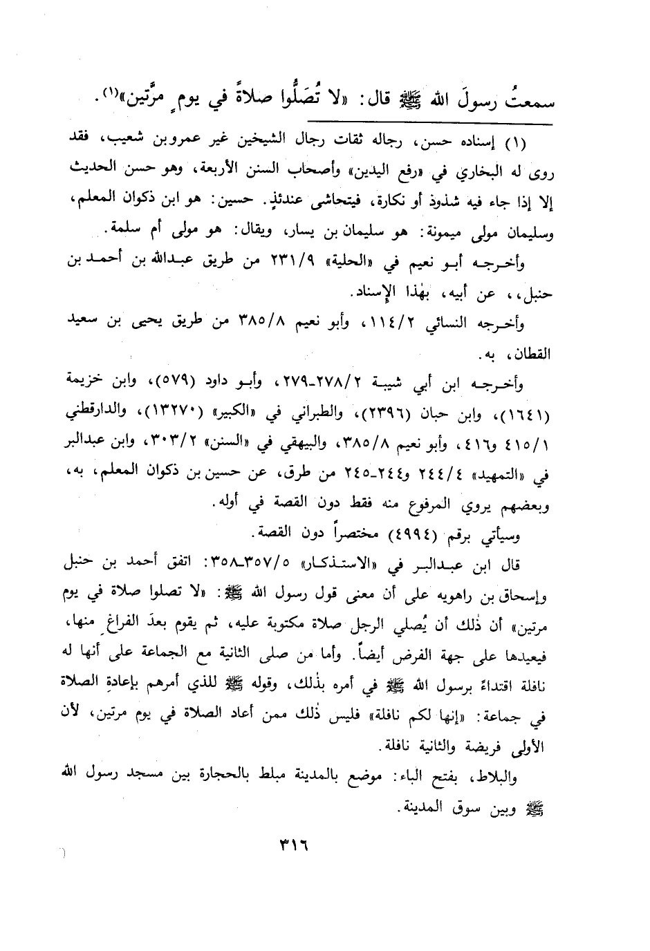 سَمِعْتُ رَسُولَ اللهِ صَلَّى اللهُ عَلَيْهِ وَسَلَّمَ قَالَ: " لَا تُصَلُّوا صَلَاةً فِي يَوْمٍ مَرَّتَيْنِ " (١)