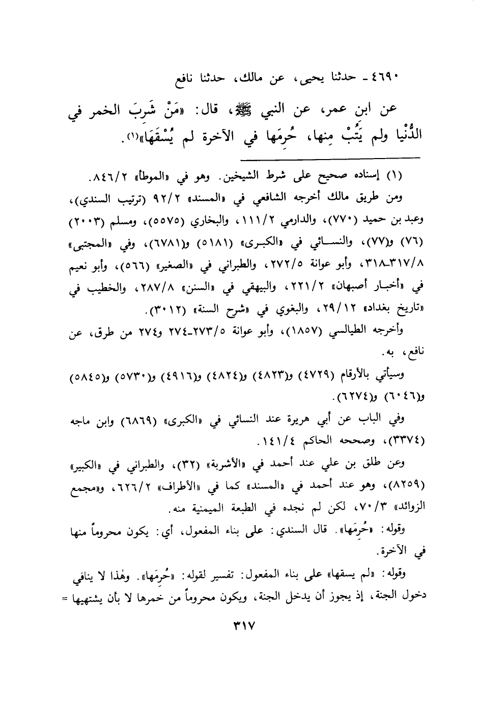 ٤٦٩٠ - حَدَّثَنَا يَحْيَى، عَنْ مَالِكٍ، حَدَّثَنَا نَافِعٌ، عَنِ ابْنِ عُمَرَ، عَنِ النَّبِيِّ صَلَّى اللهُ عَلَيْهِ وَسَلَّمَ قَالَ: " مَنْ شَرِبَ الْخَمْرَ فِي الدُّنْيَا وَلَمْ يَتُبْ مِنْهَا، حُرِمَهَا فِي الْآخِرَةِ لَمْ يُسْقَهَا " (١)