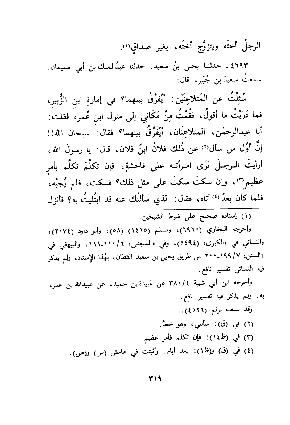 ٤٦٩٣ - حَدَّثَنَا يَحْيَى بْنُ سَعِيدٍ، حَدَّثَنَا عَبْدُ الْمَلِكِ بْنُ أَبِي سُلَيْمَانَ، سَمِعْتُ سَعِيدَ بْنَ جُبَيْرٍ، قَالَ: سُئِلْتُ عَنِ الْمُتَلَاعِنَيْنِ، أَيُفَرَّقُ بَيْنَهُمَا؟ فِي إِمَارَةِ ابْنِ الزُّبَيْرِ فَمَا دَرَيْتُ مَا أَقُولُ، فَقُمْتُ مِنْ مَكَانِي إِلَى مَنْزِلِ ابْنِ عُمَرَ، فَقُلْتُ: أَبَا عَبْدِ الرَّحْمَنِ، الْمُتَلَاعِنَانِ، أَيُفَرَّقُ بَيْنَهُمَا؟ فَقَالَ: سُبْحَانَ اللهِ إِنَّ أَوَّلَ مَنْ سَأَلَ (٢) عَنْ ذَلِكَ فُلَانُ بْنُ فُلَانٍ، قَالَ: يَا رَسُولَ اللهِ، أَرَأَيْتَ الرَّجُلَ يَرَى امْرَأَتَهُ عَلَى فَاحِشَةٍ، فَإِنْ تَكَلَّمَ تَكَلَّمَ بِأَمْرٍ عَظِيمٍ، (٣) وَإِنْ سَكَتَ سَكَتَ عَلَى مِثْلِ ذَلِكَ؟، فَسَكَتَ، فَلَمْ يُجِبْهُ، فَلَمَّا كَانَ بَعْدُ (٤) أَتَاهُ، فَقَالَ: الَّذِي سَأَلْتُكَ عَنْهُ قَدِ ابْتُلِيتُ بِهِ؟ فَأَنْزَلَ
