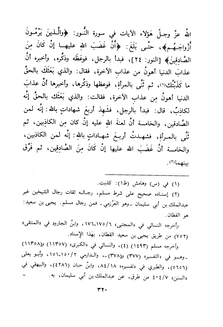 اللهُ عَزَّ وَجَلَّ هَؤُلَاءِ الْآيَاتِ فِي سُورَةِ النُّورِ: {وَالَّذِينَ يَرْمُونَ أَزْوَاجَهُمْ} [النور: ٦] حَتَّى بَلَغَ {أَنَّ غَضَبَ اللهِ عَلَيْهَا إِنْ كَانَ مِنَ الصَّادِقِينَ} [النور: ٩] ، " فَبَدَأَ بِالرَّجُلِ، فَوَعَظَهُ وَذَكَّرَهُ، وَأَخْبَرَهُ أَنَّ عَذَابَ الدُّنْيَا أَهْوَنُ مِنْ عَذَابِ الْآخِرَةِ "، فَقَالَ: وَالَّذِي بَعَثَكَ بِالْحَقِّ مَا كَذَبْتُكَ، (١) " ثُمَّ ثَنَّى بِالْمَرْأَةِ فَوَعَظَهَا وَذَكَّرَهَا، وَأَخْبَرَهَا أَنَّ عَذَابَ الدُّنْيَا أَهْوَنُ مِنْ عَذَابِ الْآخِرَةِ "، فَقَالَتْ: وَالَّذِي بَعَثَكَ بِالْحَقِّ إِنَّهُ لَكَاذِبٌ، قَالَ: " فَبَدَأَ بِالرَّجُلِ، فَشَهِدَ أَرْبَعَ شَهَادَاتٍ بِاللهِ: إِنَّهُ لَمِنَ الصَّادِقِينَ، وَالْخَامِسَةَ أَنَّ لَعْنَةَ اللهِ عَلَيْهِ إِنْ كَانَ مِنَ الْكَاذِبِينَ، ثُمَّ ثَنَّى بِالْمَرْأَةِ، فَشَهِدَتْ أَرْبَعَ شَهَادَاتٍ بِاللهِ: إِنَّهُ لَمِنَ الْكَاذِبِينَ، وَالْخَامِسَةَ أَنَّ غَضَبَ اللهِ عَلَيْهَا إِنْ كَانَ مِنَ الصَّادِقِينَ، ثُمَّ فَرَّقَ بَيْنَهُمَا " (٢)