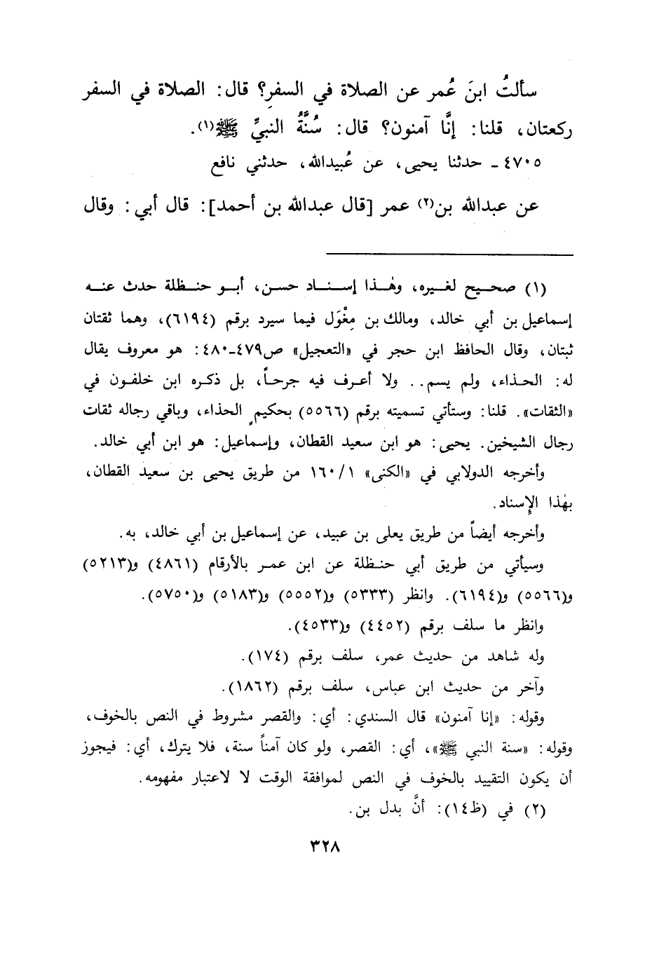 سَأَلْتُ ابْنَ عُمَرَ: عَنِ الصَّلَاةِ فِي السَّفَرِ، قَالَ: " الصَّلَاةُ فِي السَّفَرِ رَكْعَتَانِ " قُلْنَا: إِنَّا آمِنُونَ قَالَ: " سُنَّةُ النَّبِيِّ صَلَّى اللهُ عَلَيْهِ وَسَلَّمَ " (١)