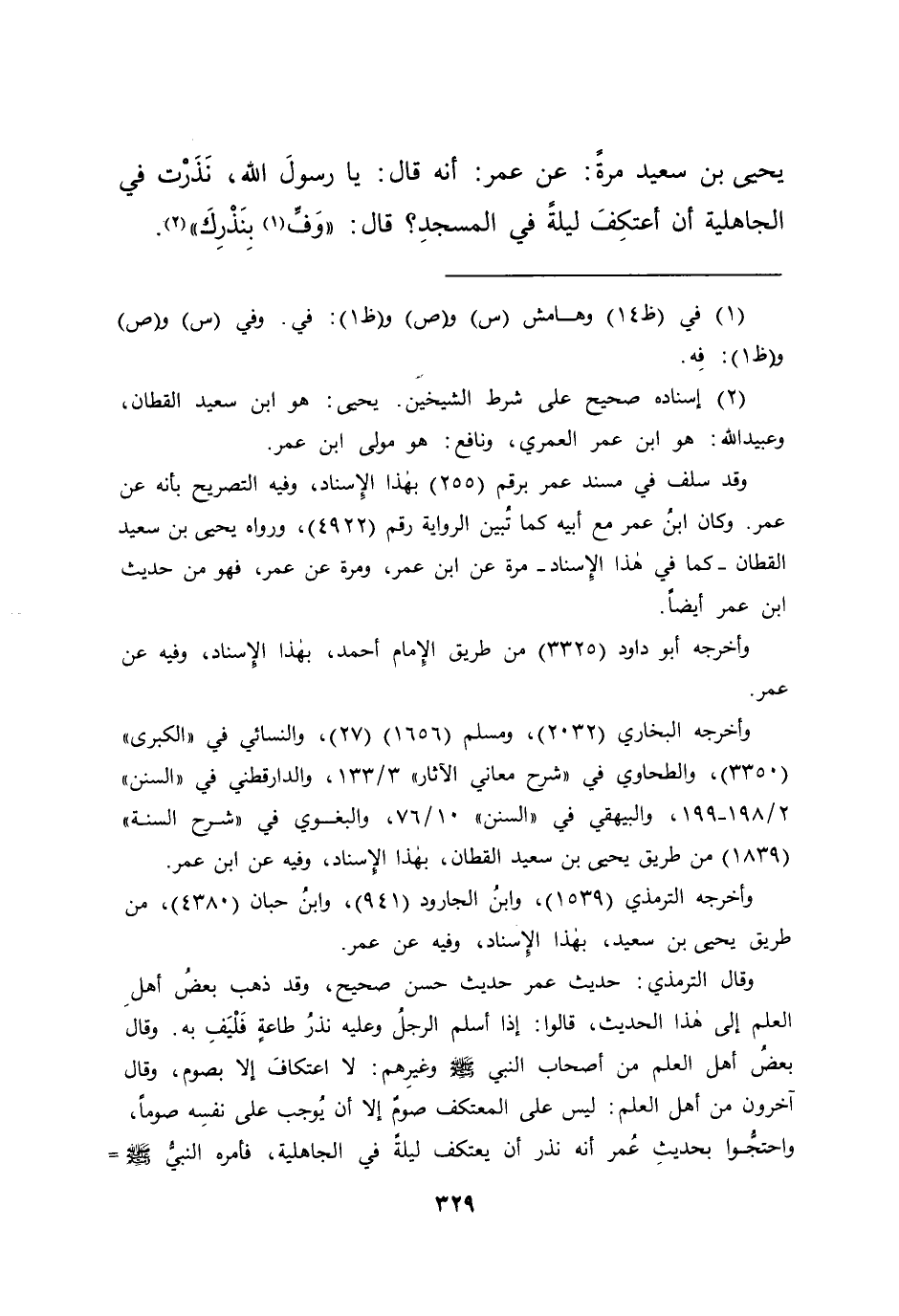 يَحْيَى بْنُ سَعِيدٍ، مَرَّةً، عَنْ عُمَرَ أَنَّهُ قَالَ: يَا رَسُولَ اللهِ، نَذَرْتُ فِي الْجَاهِلِيَّةِ أَنْ أَعْتَكِفَ لَيْلَةً فِي الْمَسْجِدِ، قَالَ: " وَفِّ (١) بِنَذْرِكَ " (٢)