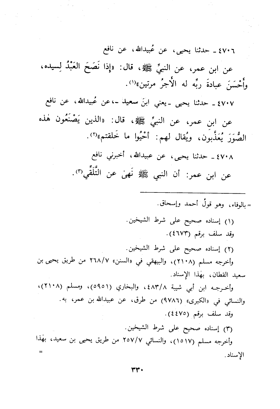 ٤٧٠٧ - حَدَّثَنَا يَحْيَى يَعْنِي ابْنَ سَعِيدٍ، عَنْ عُبَيْدِ اللهِ، عَنْ نَافِعٍ عَنِ ابْنِ عُمَرَ، عَنِ النَّبِيِّ صَلَّى اللهُ عَلَيْهِ وَسَلَّمَ قَالَ: " الَّذِينَ يَصْنَعُونَ هَذِهِ الصُّوَرَ يُعَذَّبُونَ وَيُقَالُ لَهُمْ: أَحْيُوا مَا خَلَقْتُمْ " (٢)