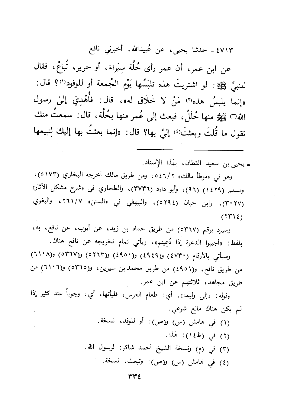 ٤٧١٣ - حَدَّثَنَا يَحْيَى، عَنْ عُبَيْدِ اللهِ، أَخْبَرَنِي نَافِعٌ، عَنِ ابْنِ عُمَرَ، أَنَّ عُمَرَ رَأَى حُلَّةَ سِيَرَاءَ أَوْ حَرِيرٍ تُبَاعُ، فَقَالَ لِلنَّبِيِّ صَلَّى اللهُ عَلَيْهِ وَسَلَّمَ: لَوِ اشْتَرَيْتَ هَذِهِ تَلْبَسُهَا يَوْمَ الْجُمُعَةِ أَوْ لِلْوُفُودِ (١) قَالَ: " إِنَّمَا يَلْبَسُ هَذِهِ (٢) مَنْ لَا خَلَاقَ لَهُ ". قَالَ: فَأُهْدِيَ إِلَى رَسُولِ اللهِ (٣) صَلَّى اللهُ عَلَيْهِ وَسَلَّمَ مِنْهَا حُلَلٌ، فَبَعَثَ إِلَى عُمَرَ مِنْهَا بِحُلَّةٍ قَالَ: سَمِعْتُ مِنْكَ تَقُولُ مَا قُلْتَ، وَبَعَثْتَ إِلَيَّ بِهَا، قَالَ: " إِنَّمَا بَعَثْتُ (٤) بِهَا إِلَيْكَ لِتَبِيعَهَا