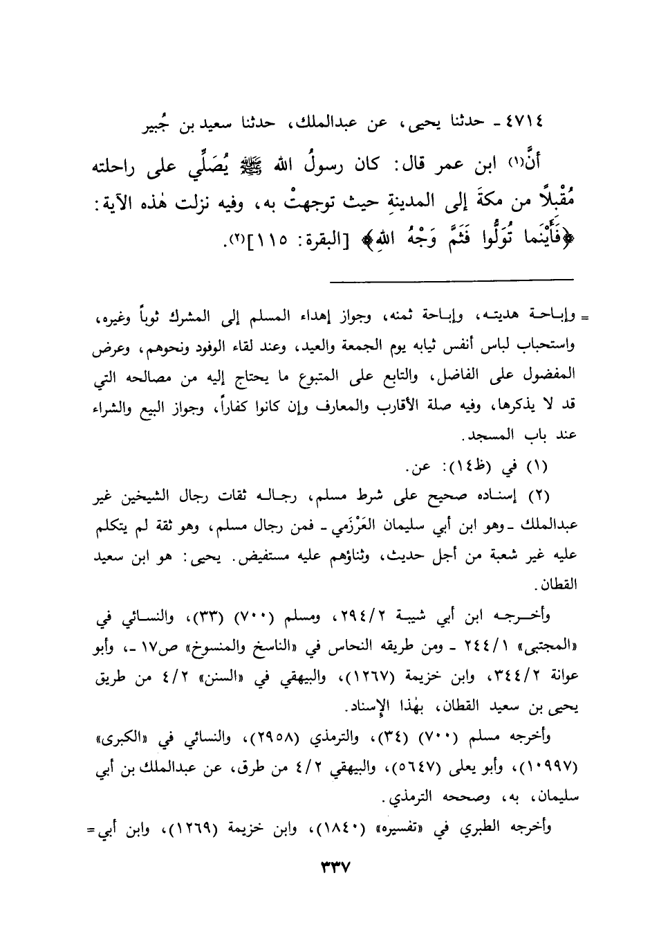 ٤٧١٤ - حَدَّثَنَا يَحْيَى، عَنْ عَبْدِ الْمَلِكِ، حَدَّثَنَا سَعِيدُ بْنُ جُبَيْرٍ، أَنَّ (١) ابْنَ عُمَرَ قَالَ: " كَانَ رَسُولُ اللهِ صَلَّى اللهُ عَلَيْهِ وَسَلَّمَ: يُصَلِّي عَلَى رَاحِلَتِهِ مُقْبِلًا مِنْ مَكَّةَ إِلَى الْمَدِينَةِ حَيْثُ تَوَجَّهَتْ بِهِ، وَفِيهِ نَزَلَتْ هَذِهِ الْآيَةُ ": {فَأَيْنَمَا تُوَلُّوا فَثَمَّ وَجْهُ اللهِ} [البقرة: ١١٥] " (٢)