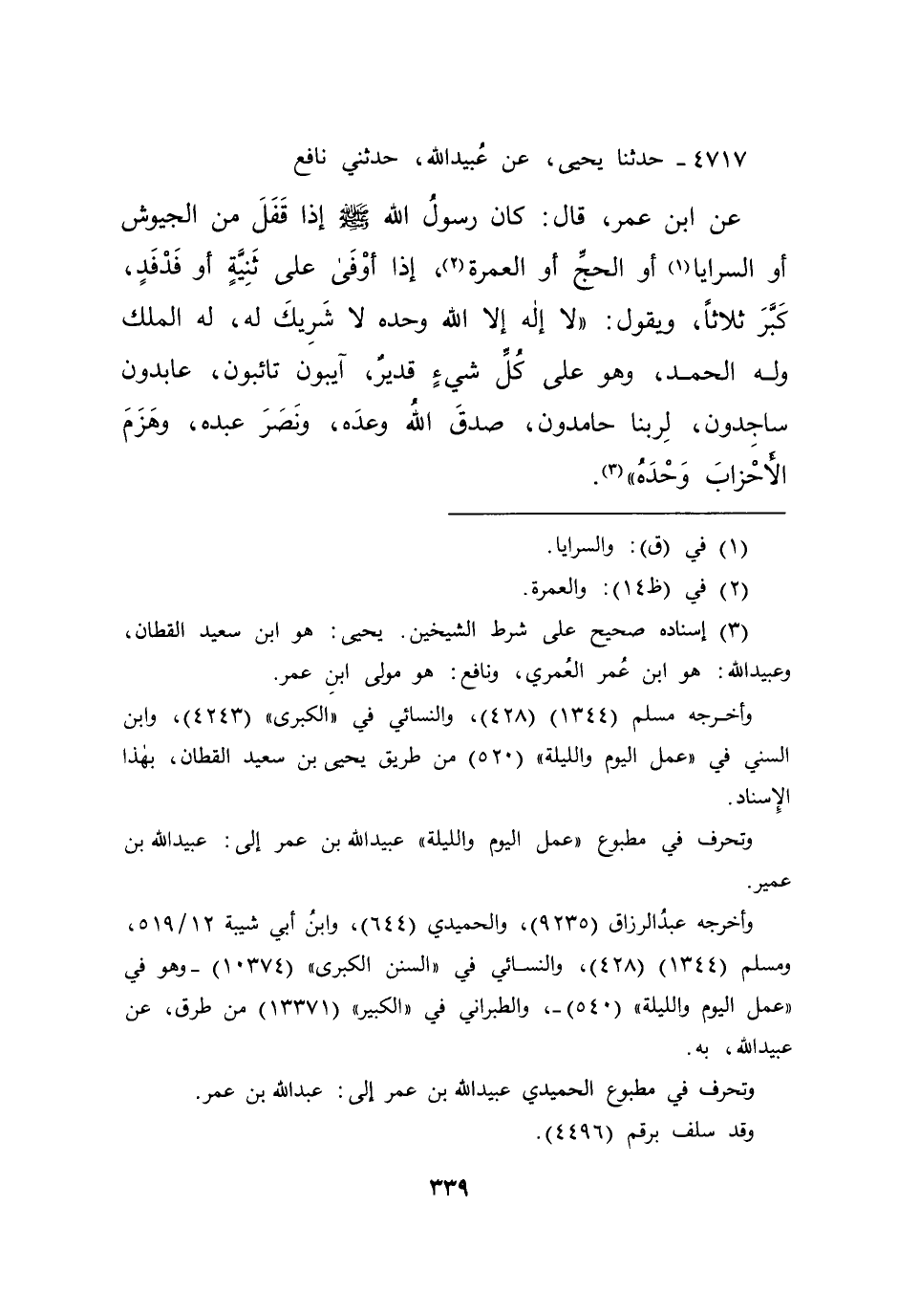 ٤٧١٧ - حَدَّثَنَا يَحْيَى، عَنْ عُبَيْدِ اللهِ، حَدَّثَنِي نَافِعٌ، عَنِ ابْنِ عُمَرَ قَالَ: كَانَ رَسُولُ اللهِ صَلَّى اللهُ عَلَيْهِ وَسَلَّمَ إِذَا قَفَلَ مِنَ الْجُيُوشِ أَوِ السَّرَايَا (١) ، أَوِ الْحَجِّ أَوِ الْعُمْرَةِ، (٢) إِذَا أَوْفَى عَلَى ثَنِيَّةٍ أَوْ فَدْفَدٍ، كَبَّرَ ثَلَاثًا، وَيَقُولُ: " لَا إِلَهَ إِلَّا اللهُ وَحْدَهُ لَا شَرِيكَ لَهُ، لَهُ الْمُلْكُ وَلَهُ الْحَمْدُ، وَهُوَ عَلَى كُلِّ شَيْءٍ قَدِيرٌ، آيِبُونَ تَائِبُونَ، عَابِدُونَ سَاجِدُونَ، لِرَبِّنَا حَامِدُونَ، صَدَقَ اللهُ وَعْدَهُ، وَنَصَرَ عَبْدَهُ، وَهَزَمَ الْأَحْزَابَ وَحْدَهُ " (٣)
