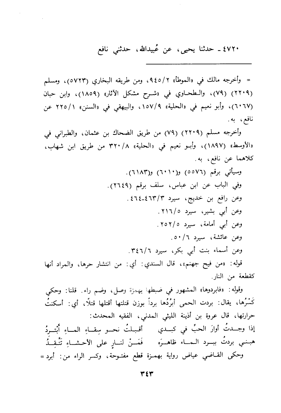 =وأخرجه مالك في "الموطأ" ٢/٤٥، ومن طريقه البخاري (٥٧٢٣) ، ومسلم (٢٢٠٩) (٧٩) ، والطحاوي في "شرح مشكل الآثار" (١٨٥٩) ، وابن حبان (٦٠٦٧) ، وأبو نعيم في "الحلية" ٩/١٥٧، والبيهقي في "السنن" ١/٢٢٥ عن نافع، به.