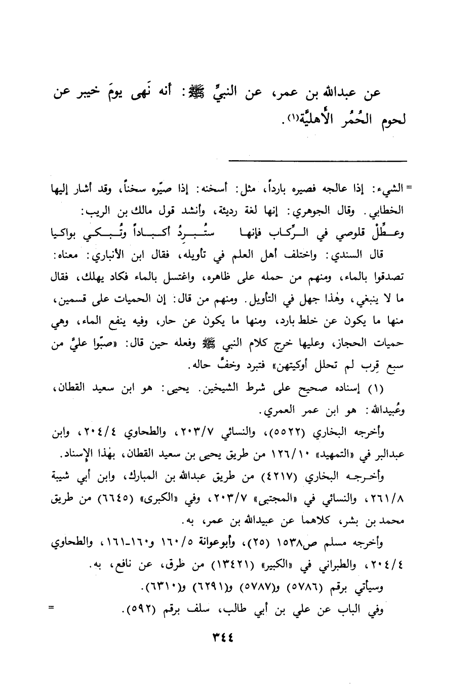 عَنْ عَبْدِ اللهِ بْنِ عُمَرَ، عَنِ النَّبِيِّ صَلَّى اللهُ عَلَيْهِ وَسَلَّمَ " أَنَّهُ نَهَى يَوْمَ خَيْبَرَ عَنْ لُحُومِ الْحُمُرِ الْأَهْلِيَّةِ " (١)