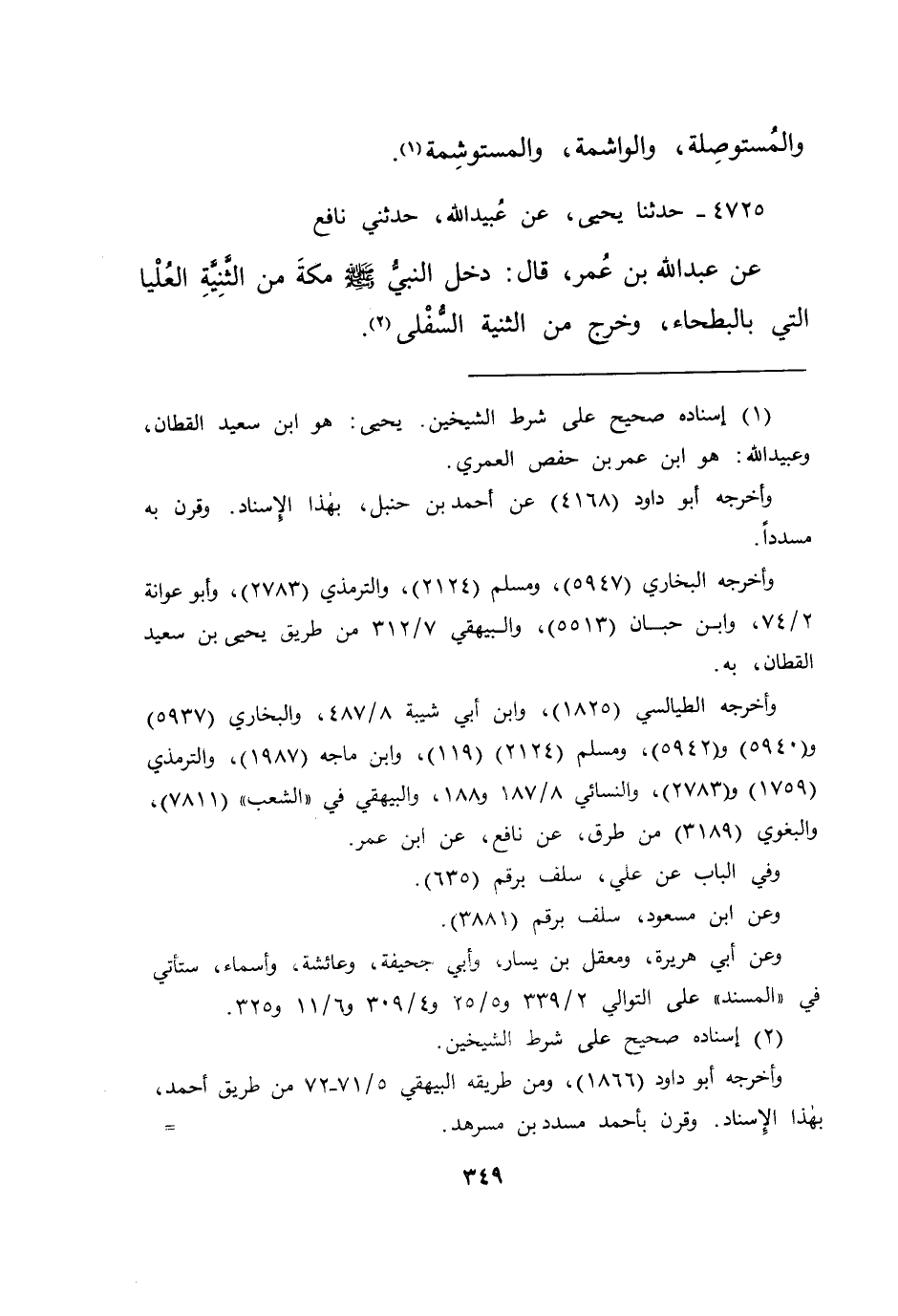 ٤٧٢٥ - حَدَّثَنَا يَحْيَى، عَنْ عُبَيْدِ اللهِ، حَدَّثَنِي نَافِعٌ، عَنْ عَبْدِ اللهِ بْنِ عُمَرَ قَالَ: " دَخَلَ النَّبِيُّ صَلَّى اللهُ عَلَيْهِ وَسَلَّمَ مَكَّةَ مِنَ الثَّنِيَّةِ الْعُلْيَا الَّتِي بِالْبَطْحَاءِ، وَخَرَجَ مِنَ الثَّنِيَّةِ السُّفْلَى " (٢)