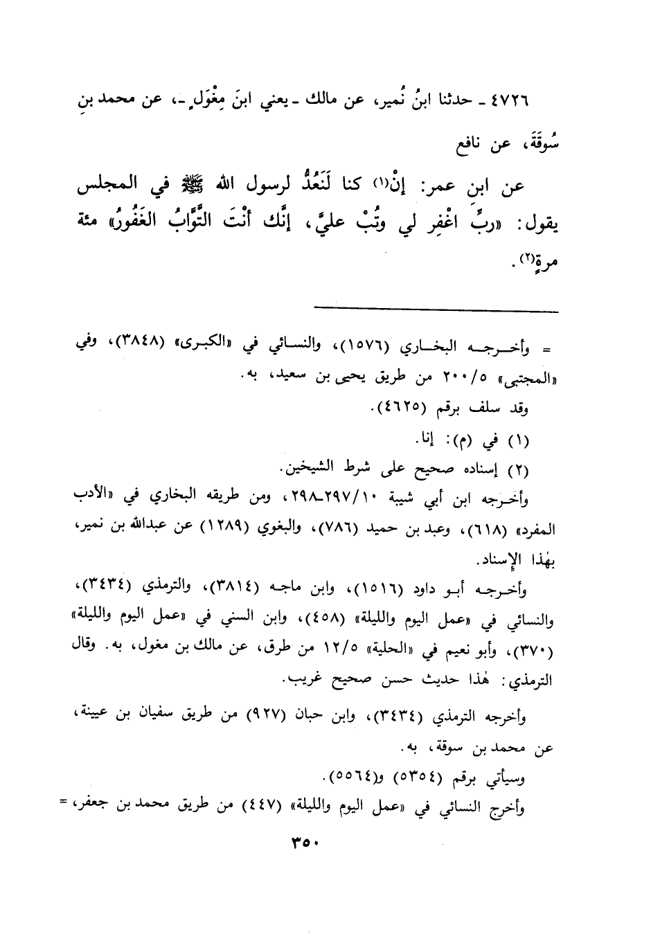 ٤٧٢٦ - حَدَّثَنَا ابْنُ نُمَيْرٍ، عَنْ مَالِكٍ يَعْنِي ابْنَ مِغْوَلٍ، عَنْ مُحَمَّدِ بْنِ سُوقَةَ، عَنْ نَافِعٍ، عَنِ ابْنِ عُمَرَ، إِنْ (١) كُنَّا لَنَعُدُّ لِرَسُولِ اللهِ صَلَّى اللهُ عَلَيْهِ وَسَلَّمَ فِي الْمَجْلِسِ يَقُولُ: " رَبِّ اغْفِرْ لِي وَتُبْ عَلَيَّ، إِنَّكَ أَنْتَ التَّوَّابُ الْغَفُورُ " مِائَةَ مَرَّةٍ (٢)
