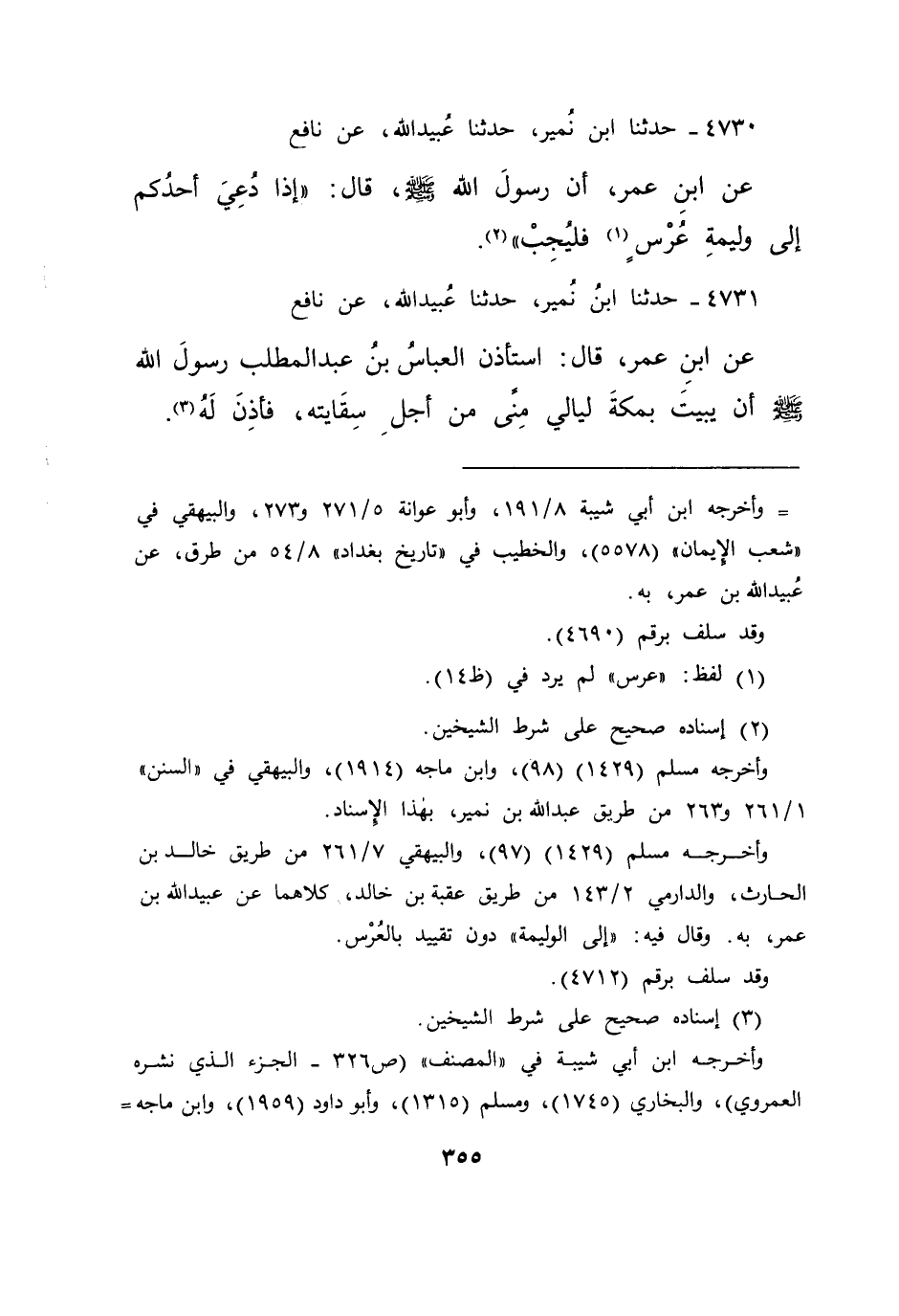 ٤٧٣١ - حَدَّثَنَا ابْنُ نُمَيْرٍ، حَدَّثَنَا عُبَيْدُ اللهِ، عَنْ نَافِعٍ، عَنِ ابْنِ عُمَرَ قَالَ: اسْتَأْذَنَ الْعَبَّاسُ بْنُ عَبْدِ الْمُطَّلِبِ رَسُولَ اللهِ صَلَّى اللهُ عَلَيْهِ وَسَلَّمَ أَنْ يَبِيتَ بِمَكَّةَ لَيَالِيَ مِنًى مِنْ أَجْلِ سِقَايَتِهِ، " فَأَذِنَ لَهُ " (٣)