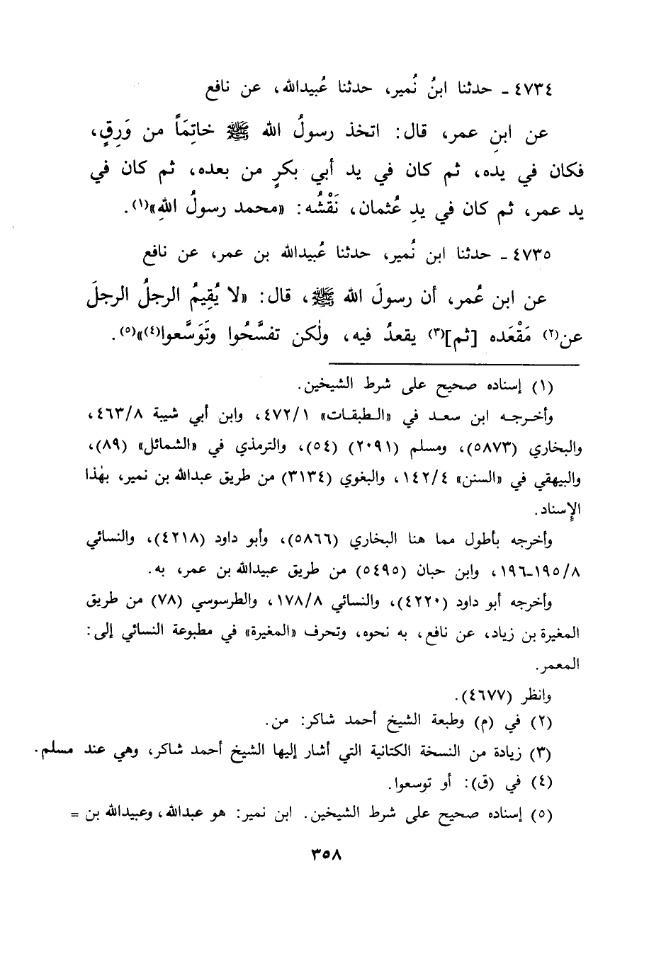٤٧٣٤ - حَدَّثَنَا ابْنُ نُمَيْرٍ، حَدَّثَنَا عُبَيْدُ اللهِ، عَنْ نَافِعٍ، عَنِ ابْنِ عُمَرَ قَالَ: " اتَّخَذَ رَسُولُ اللهِ صَلَّى اللهُ عَلَيْهِ وَسَلَّمَ خَاتَمًا مِنْ وَرِقٍ فَكَانَ فِي يَدِهِ ". ثُمَّ كَانَ فِي يَدِ أَبِي بَكْرٍ مِنْ بَعْدِهِ، ثُمَّ كَانَ فِي يَدِ عُمَرَ، ثُمَّ كَانَ فِي يَدِ عُثْمَانَ نَقْشُهُ مُحَمَّدٌ رَسُولُ اللهِ (١)