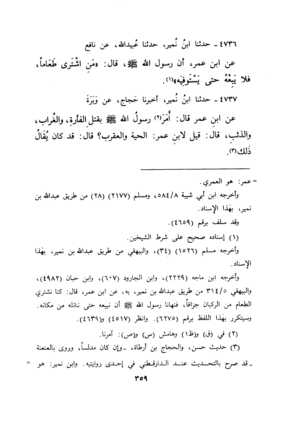 ٤٧٣٦ - حَدَّثَنَا ابْنُ نُمَيْرٍ، حَدَّثَنَا عُبَيْدُ اللهِ، عَنْ نَافِعٍ، عَنِ ابْنِ عُمَرَ، أَنَّ رَسُولَ اللهِ صَلَّى اللهُ عَلَيْهِ وَسَلَّمَ قَالَ: " مَنِ اشْتَرَى طَعَامًا فَلَا يَبِعْهُ حَتَّى يَسْتَوْفِيَهُ " (١)