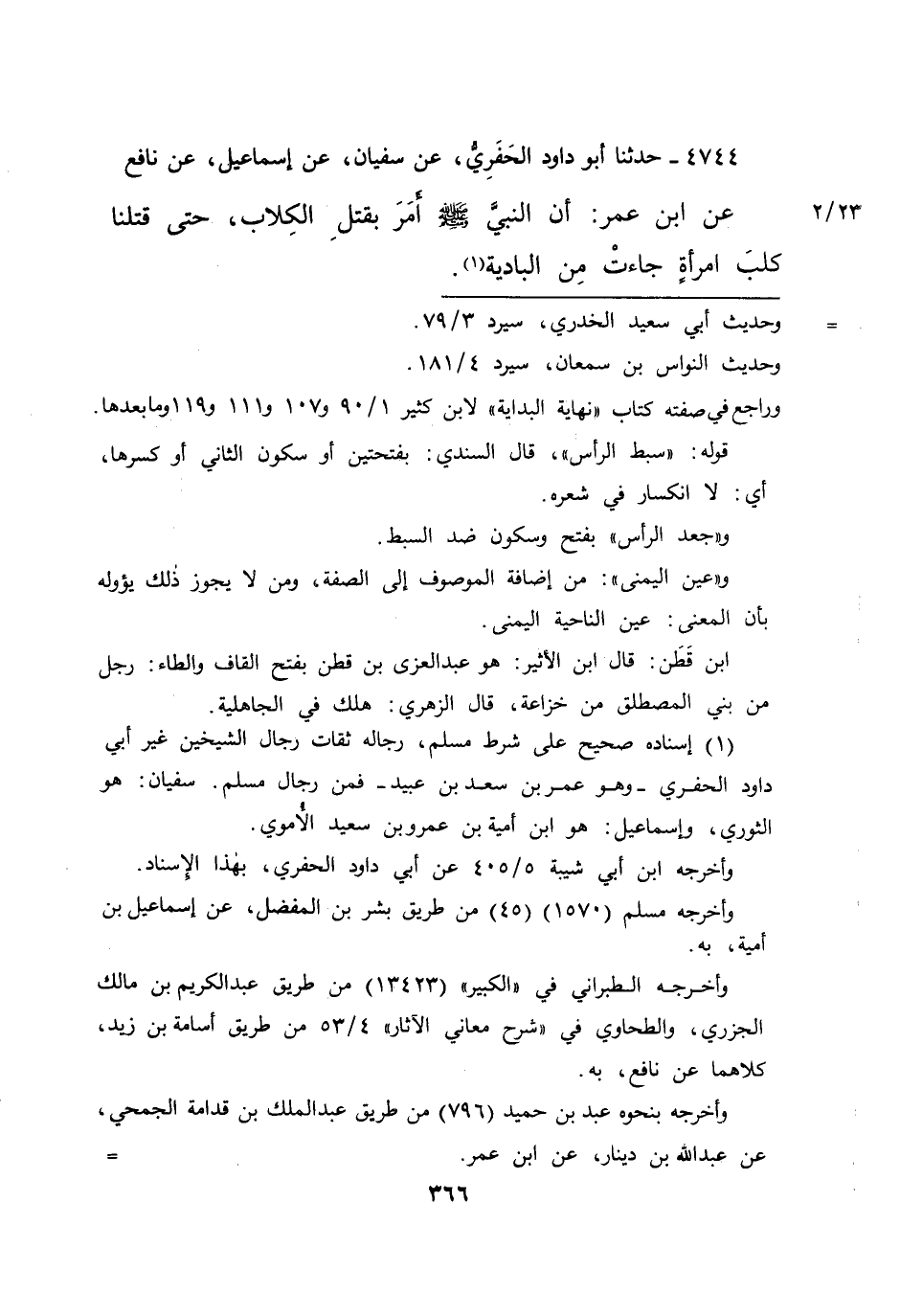 ٤٧٤٤ - حَدَّثَنَا أَبُو دَاوُدَ الْحَفَرِيُّ، عَنْ سُفْيَانَ، عَنْ إِسْمَاعِيلَ، عَنْ نَافِعٍ، عَنِ ابْنِ عُمَرَ، " أَنَّ النَّبِيَّ صَلَّى اللهُ عَلَيْهِ وَسَلَّمَ: أَمَرَ بِقَتْلِ الْكِلَابِ، حَتَّى قَتَلْنَا كَلْبَ امْرَأَةٍ جَاءَتْ مِنْ الْبَادِيَةِ " (١)