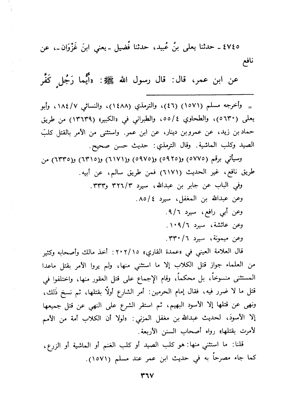 =وأخرجه مسلم (١٥٧١) (٤٦) ، والترمذي (١٤٨٨) ، والنسائي ٧/١٨٤، وأبو يعلى (٥٦٣٠) ، والطحاوي ٤/٥٥، والطبراني في "الكبير" (١٣٦٣٩) من طريق حماد بن زيد، عن عمرو بن دينار، عن ابن عمر. واستثنى من الأمر بالقتل، كلب الصيد وكلب الماشية. وقال الترمذي: حديث حسن صحيح.