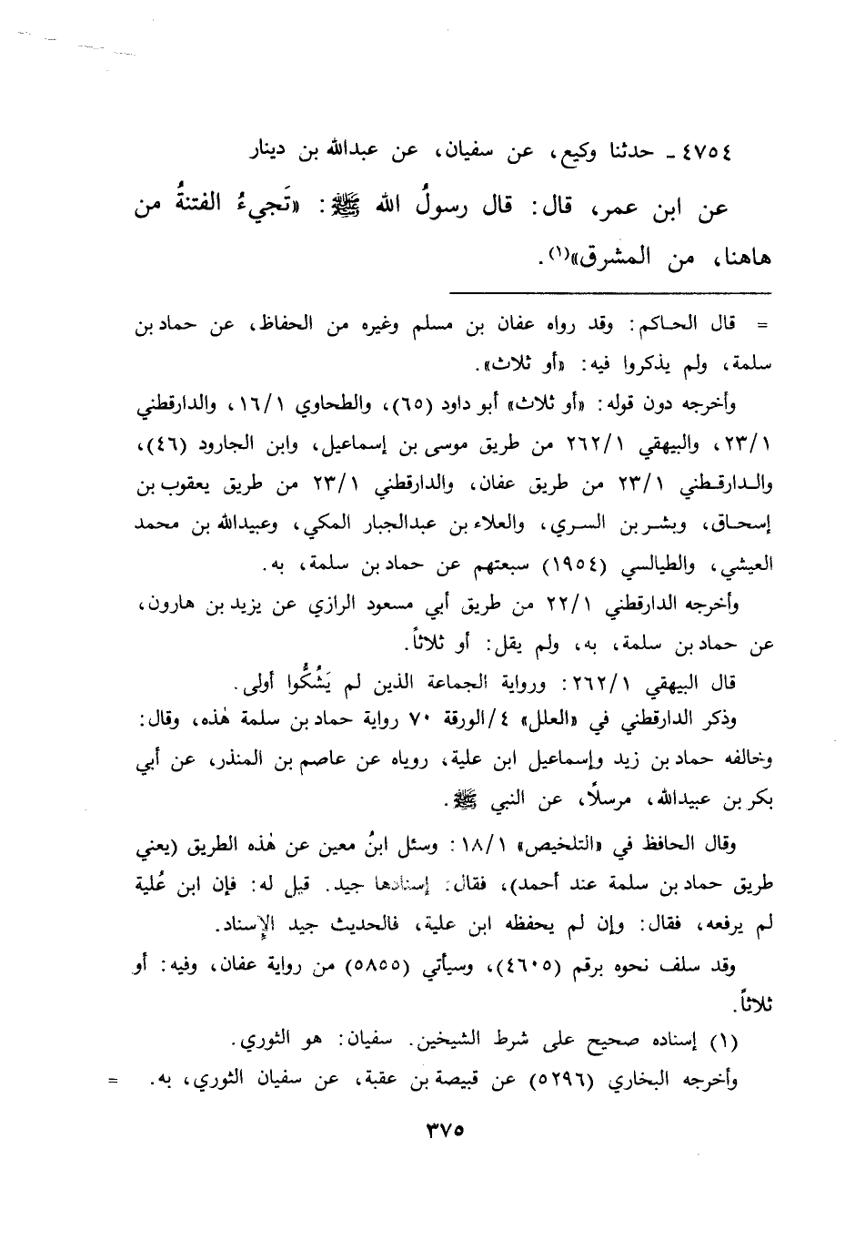 =قال الحاكم: وقد رواه عفان بن مسلم وغيره من الحفاظ، عن حماد بن سلمة، ولم يذكروا فيه: "أو ثلاث ".