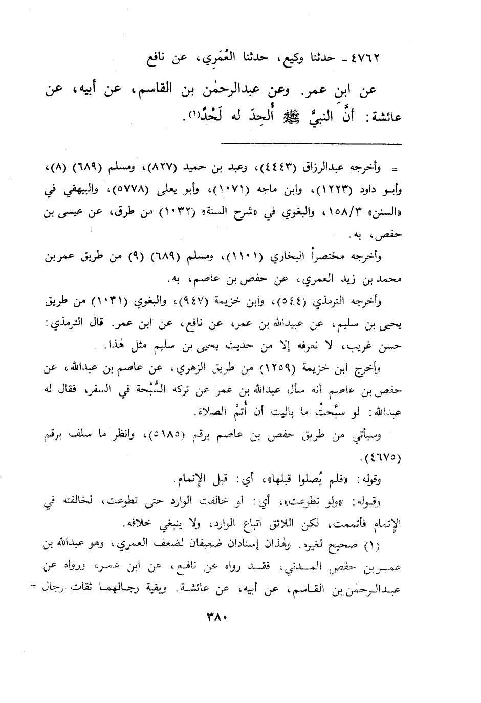 =وأخرجه عبد الرزاق (٤٤٤٣) ، وعبد بن حميد (٨٢٧) ، ومسلم (٦٨٩) (٨) ، وأبو داود (١٢٢٣) ، وابن ماجه (١٠٧١) ، وأبو يعلي (٥٧٧٨) ، والبيهقي في "السنن " ٣/١٥٨، والبغوي في "شرح السنة" (١٠٣٢) من طرق، عن عيسى بن حفص، به.