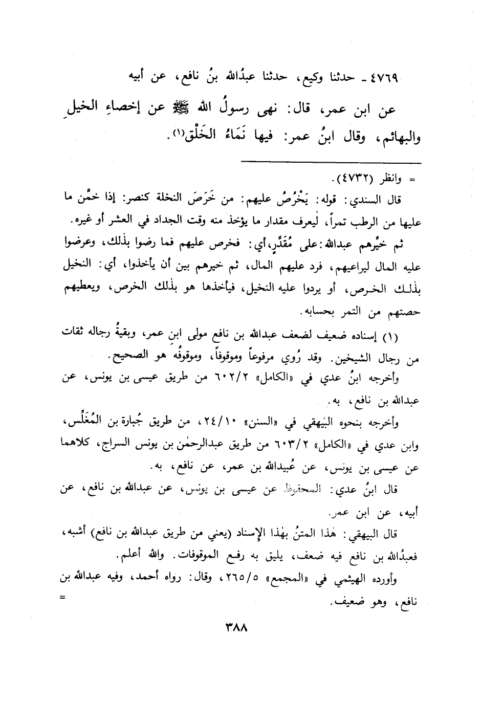 ٤٧٦٩ - حَدَّثَنَا وَكِيعٌ، حَدَّثَنَا عَبْدُ اللهِ بْنُ نَافِعٍ، عَنْ أَبِيهِ، عَنِ ابْنِ عُمَرَ قَالَ: " نَهَى رَسُولُ اللهِ صَلَّى اللهُ عَلَيْهِ وَسَلَّمَ عَنْ إِخْصَاءِ الْخَيْلِ وَالْبَهَائِمِ " وقَالَ ابْنُ عُمَرَ فِيهَا نَمَاءُ الْخَلْقِ " (١)